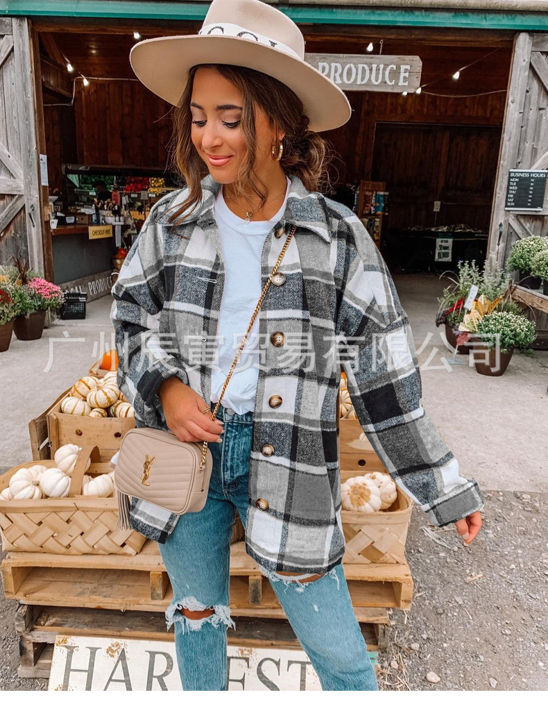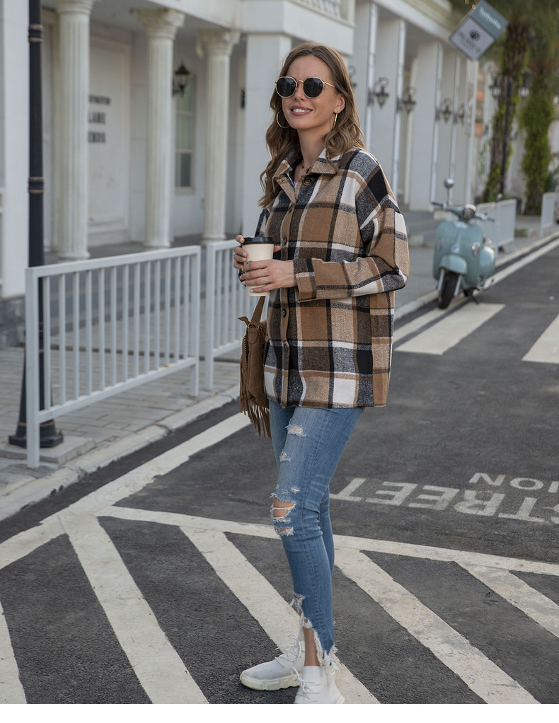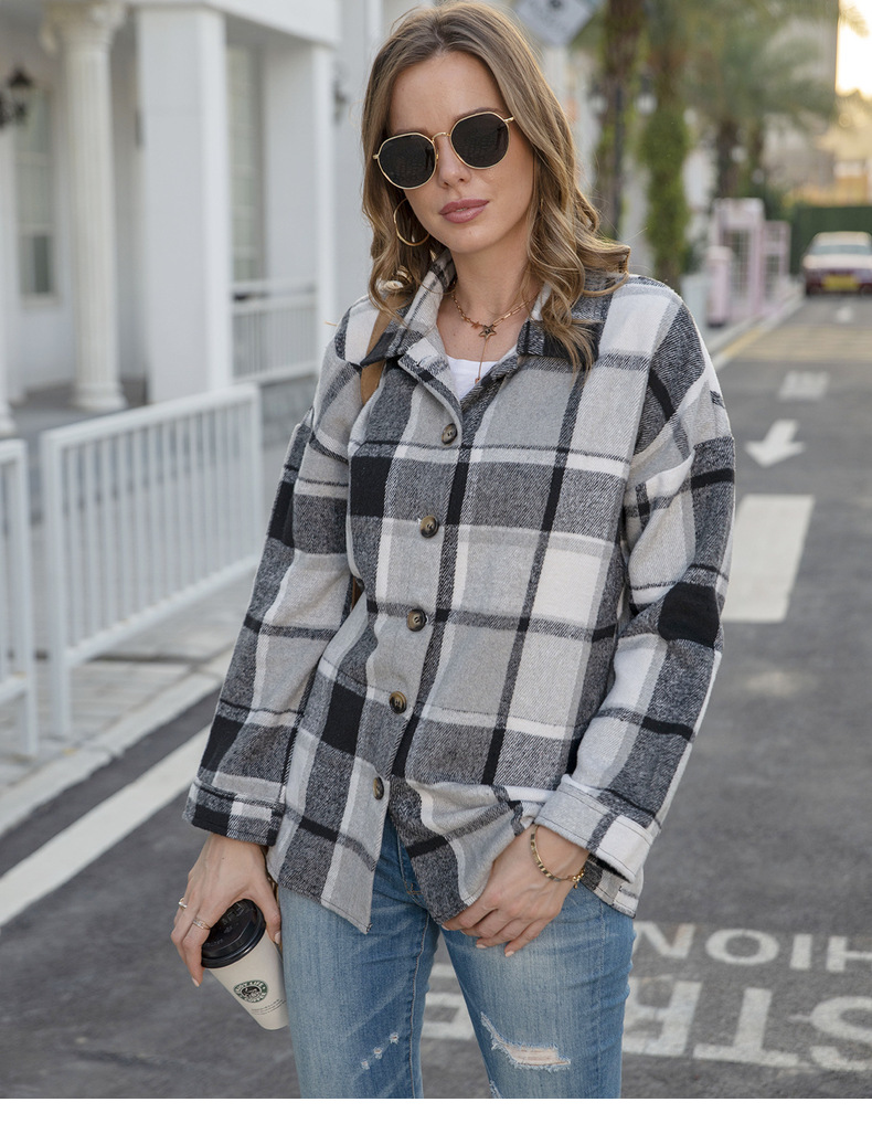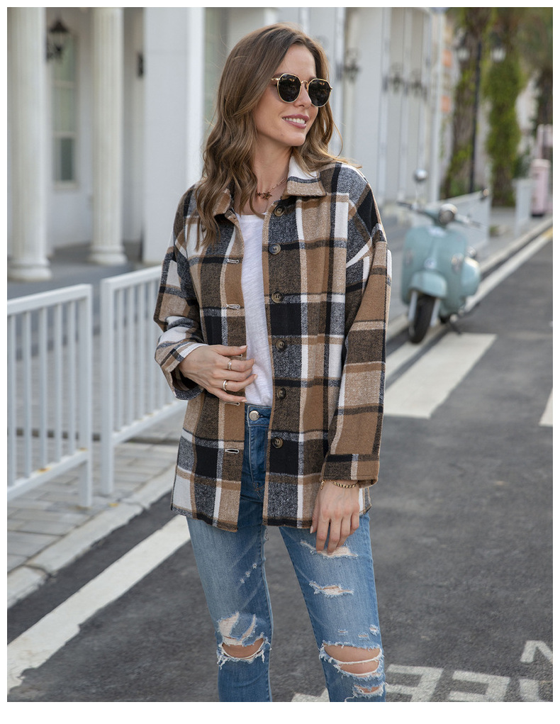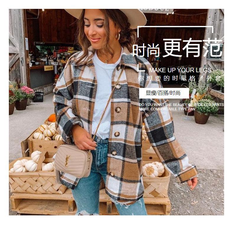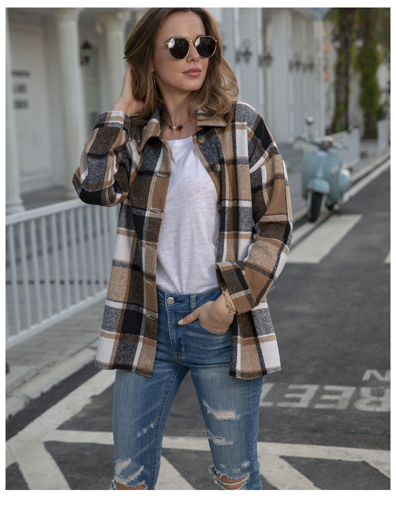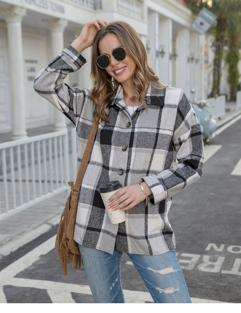 인터넷 연예인 가을 거리 우아한 유럽과 미국의 긴팔 옷깃 느슨한 여성용 격자 무늬 셔츠 중간 길이 재킷스토어 가기