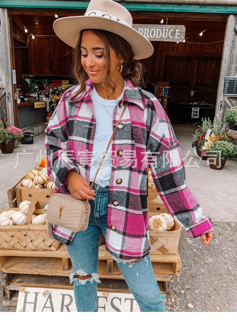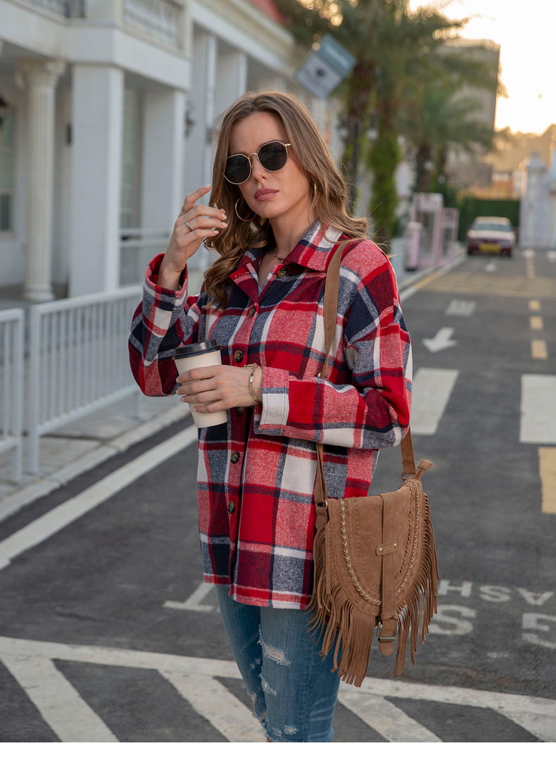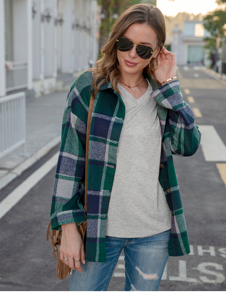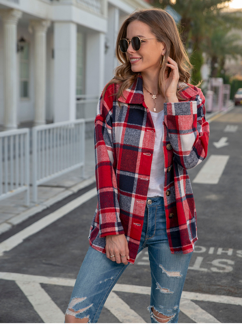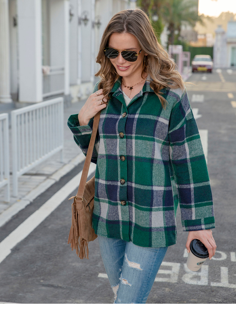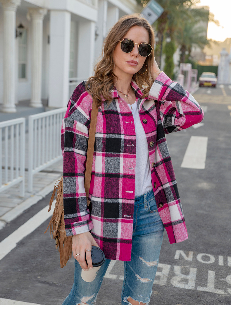 인터넷 연예인 가을 거리 우아한 유럽과 미국의 긴팔 옷깃 느슨한 여성용 격자 무늬 셔츠 중간 길이 재킷스토어 가기