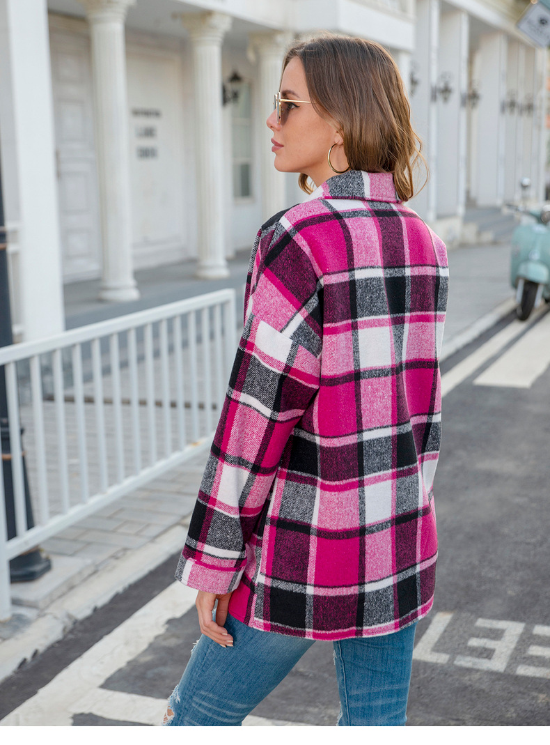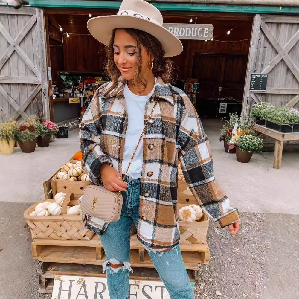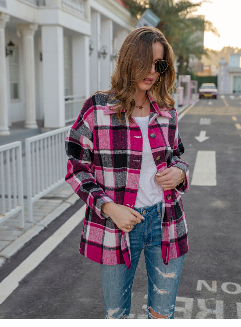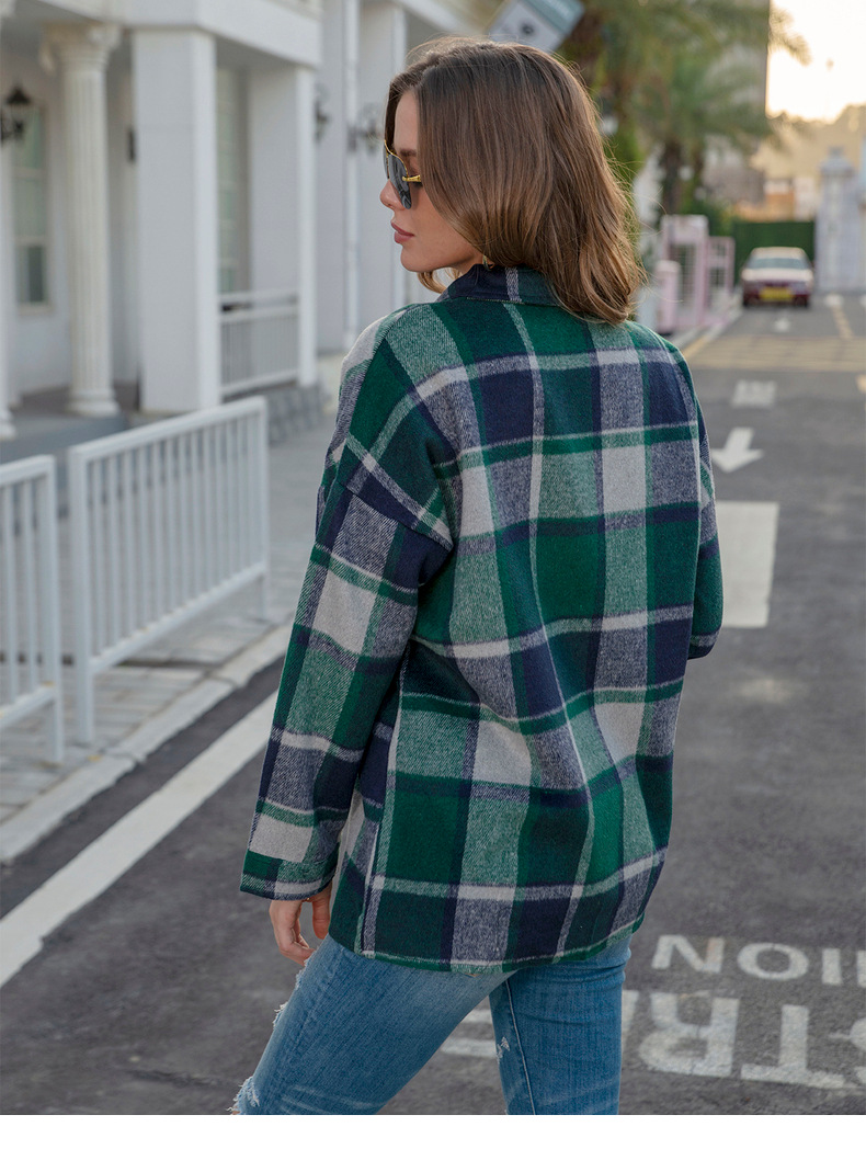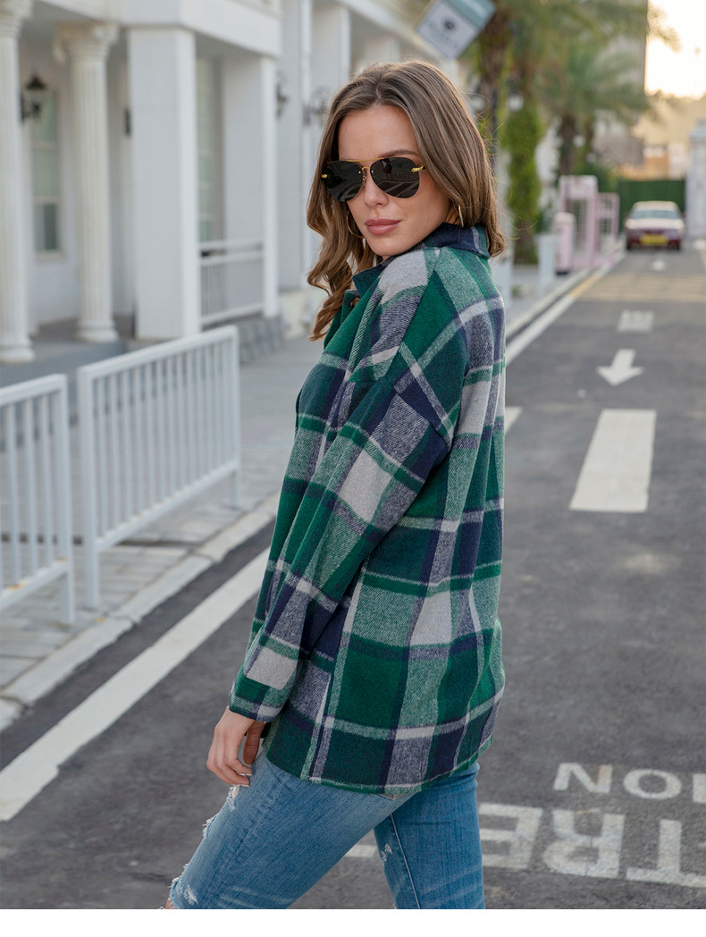 인터넷 연예인 가을 거리 우아한 유럽과 미국의 긴팔 옷깃 느슨한 여성용 격자 무늬 셔츠 중간 길이 재킷스토어 가기