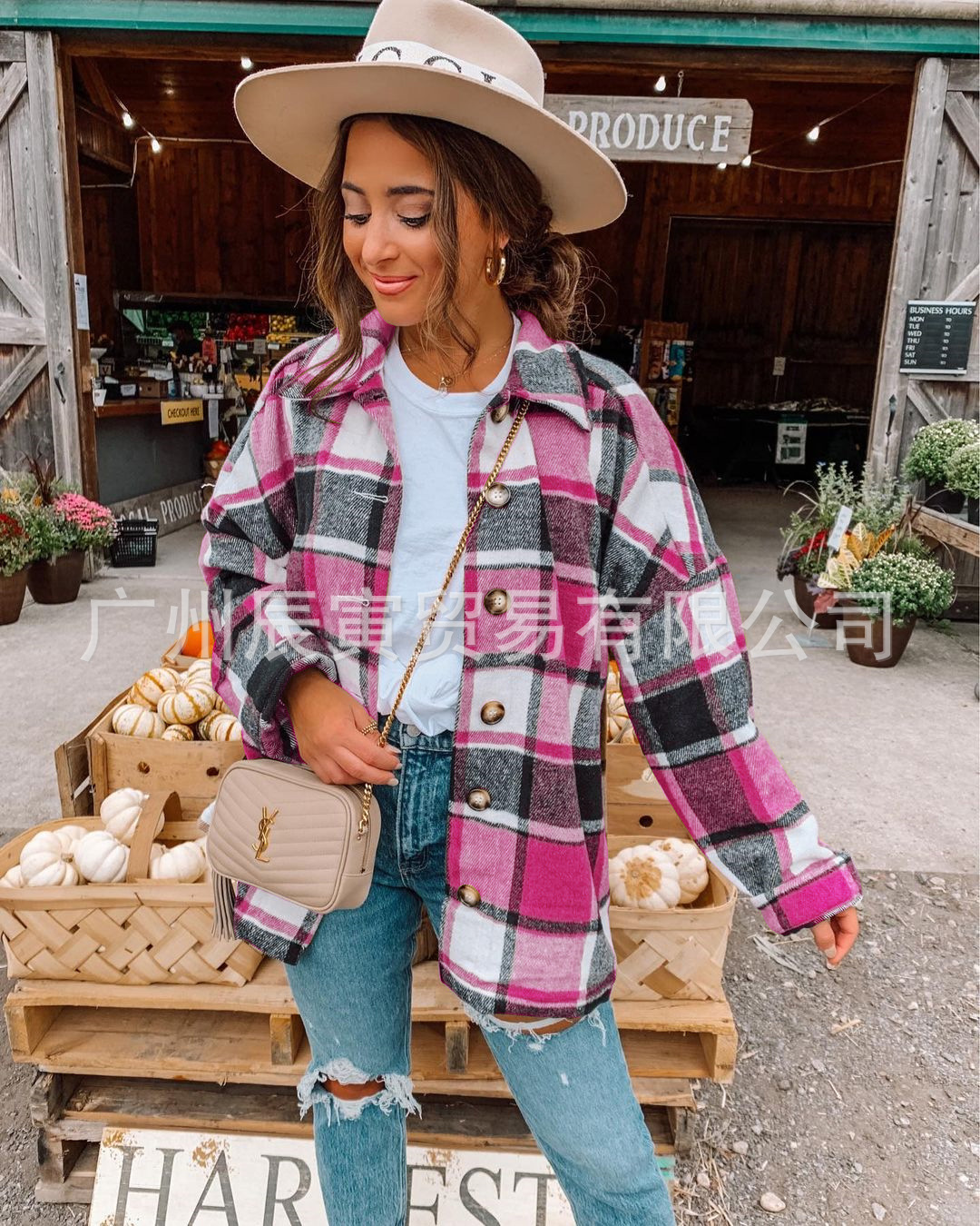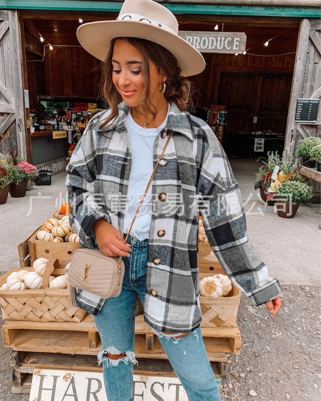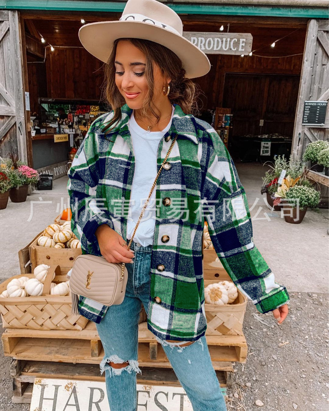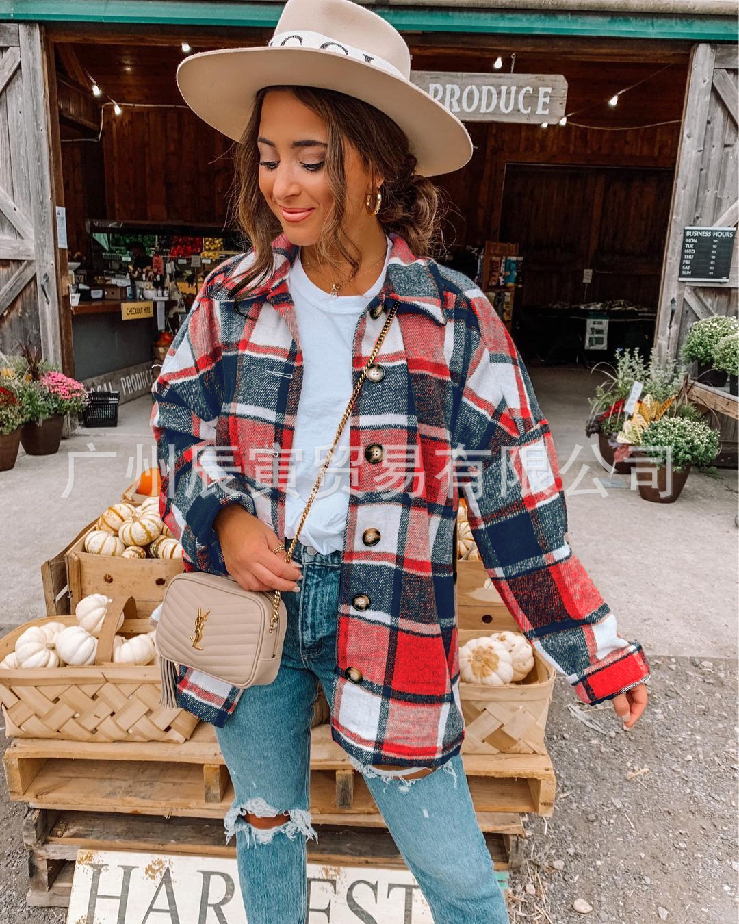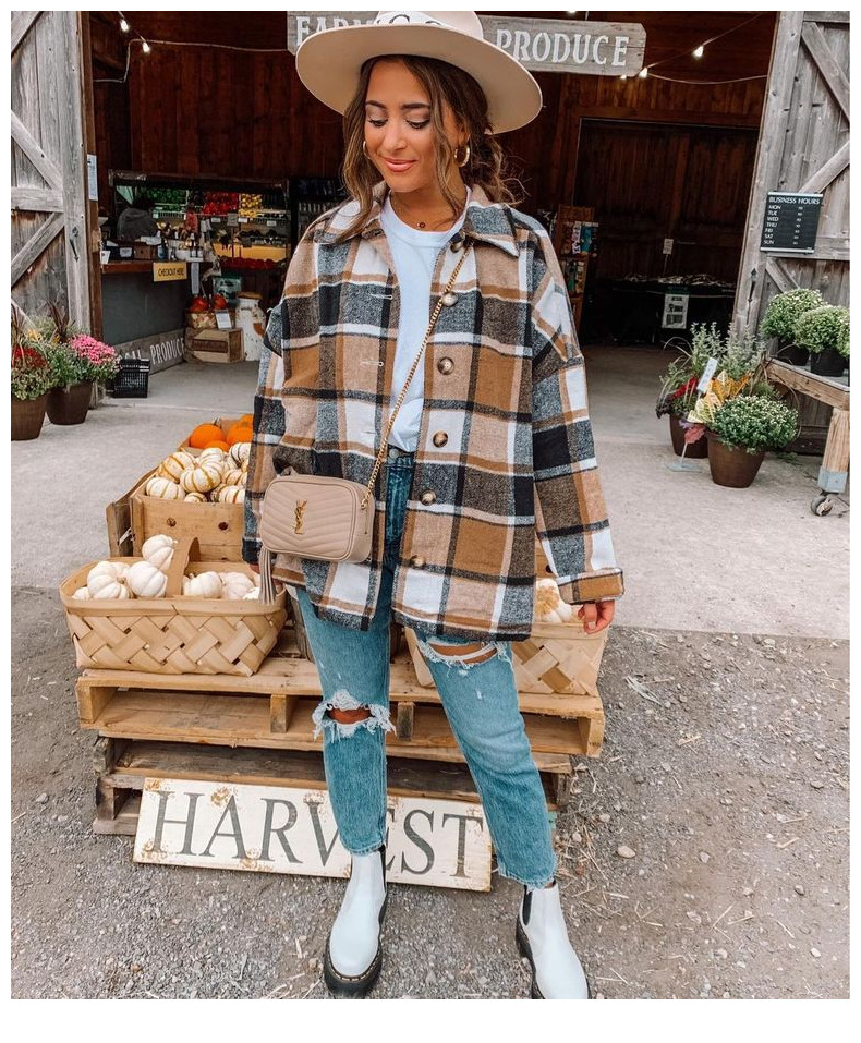 인터넷 연예인 가을 거리 우아한 유럽과 미국의 긴팔 옷깃 느슨한 여성용 격자 무늬 셔츠 중간 길이 재킷스토어 가기