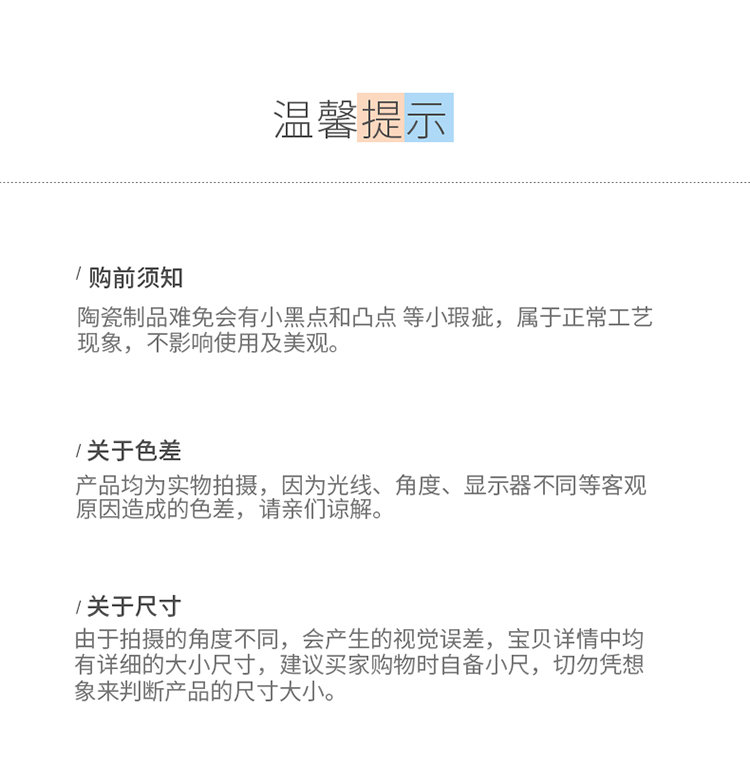 本店支持1件代发,如果不能拍下1件的产品请联系客服修改。新疆、西藏、内蒙古、青海、宁夏、甘肃、海南及其他省份的偏远地区运费价格较高,请与客服确认运费后进行购买。《广告法》规定:所售商品不得使用绝对化用词和功能性用词。本店已对产品逐一排查,如有遗漏绝对化用词和功能性用词全部无效,不可作为赔付理由。如消费者发现该类词汇,辛苦您及时反馈给客服,我们会尽快修改。感谢您的支持与厚爱!