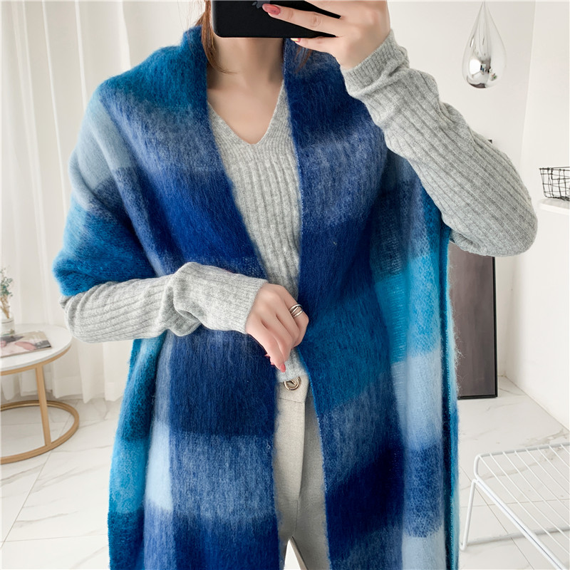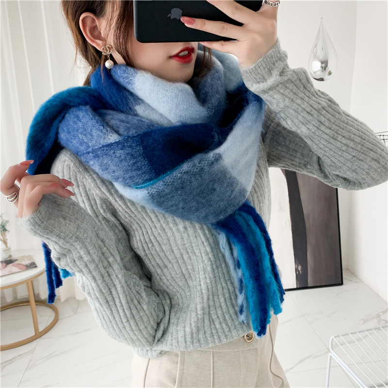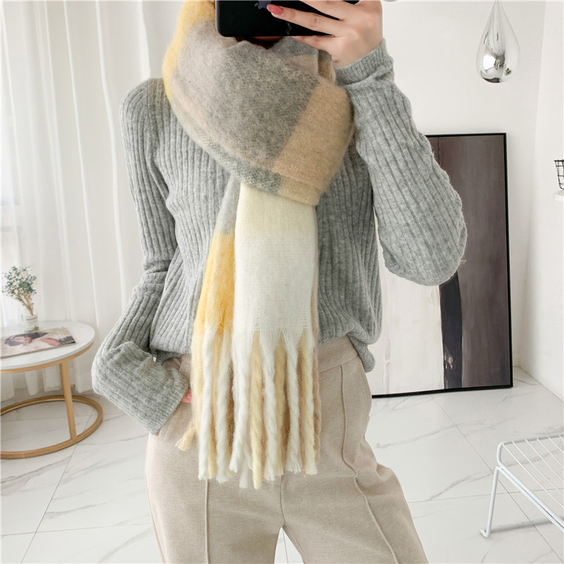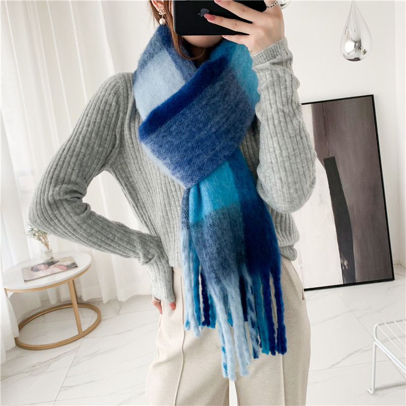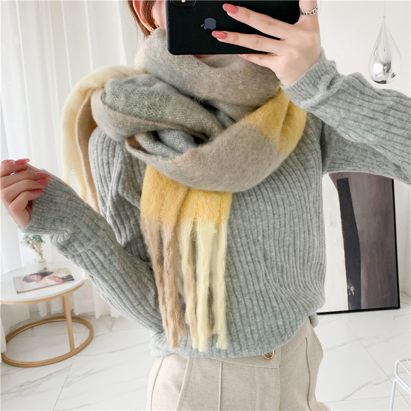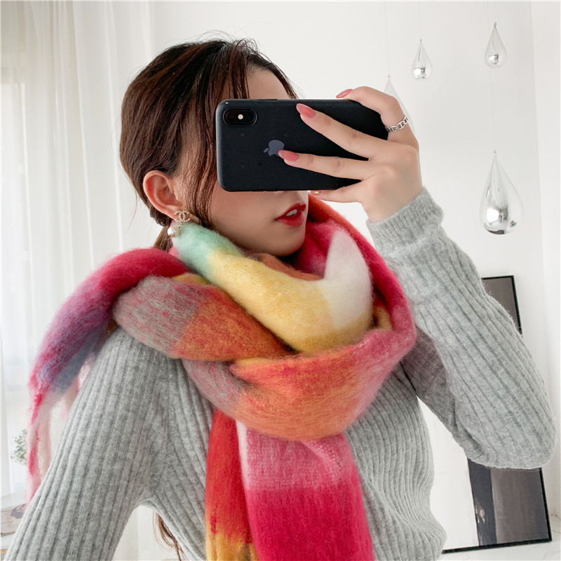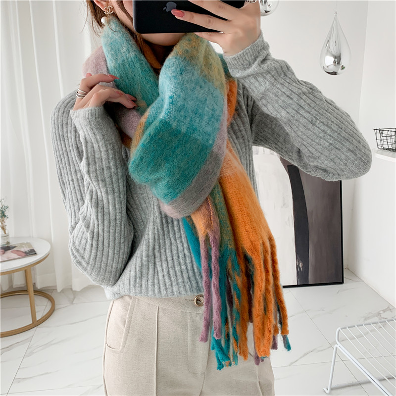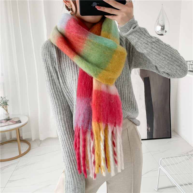 리안 케 컬러 두꺼운 브레이드 레인보우 격자 무늬 컬러 블록 스카프 겨울 캐시미어 술 우아한 숄 스카프 학생 여성스토어 가기