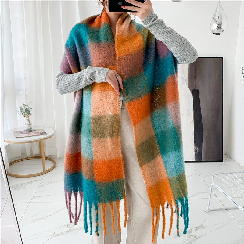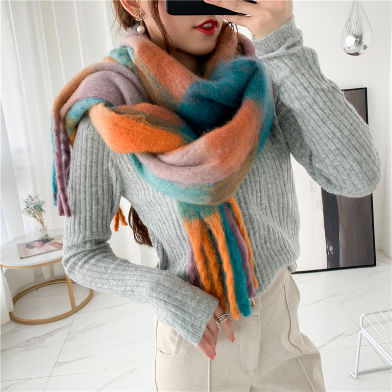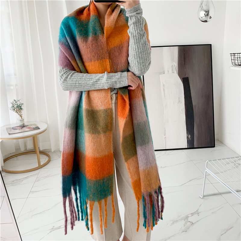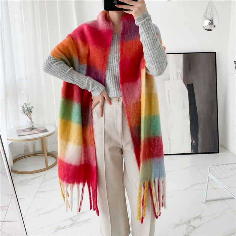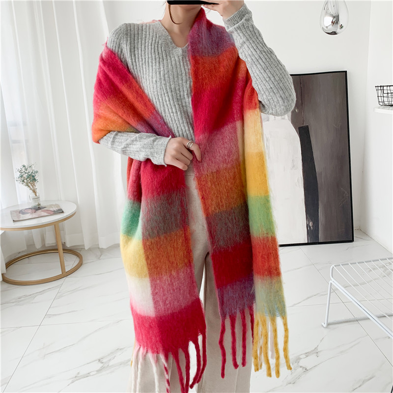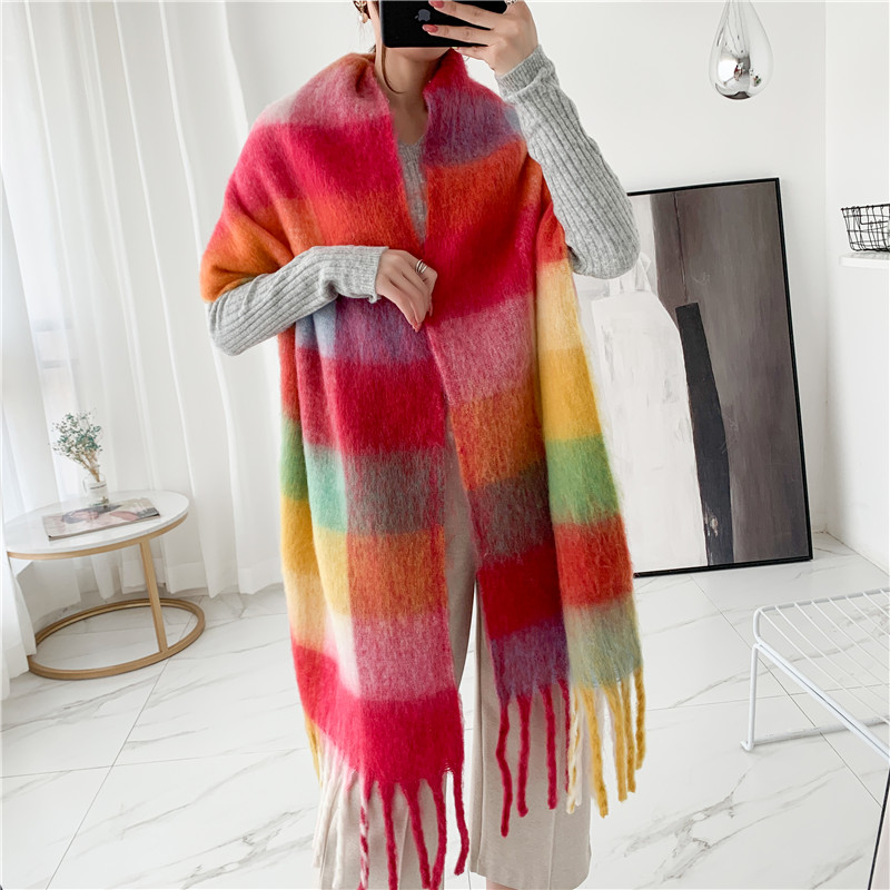 리안 케 컬러 두꺼운 브레이드 레인보우 격자 무늬 컬러 블록 스카프 겨울 캐시미어 술 우아한 숄 스카프 학생 여성