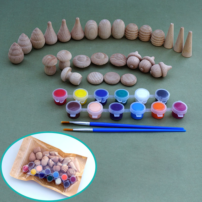 一套8种形状小积木每种3个,一共24个,配好丙烯颜料跟笔。