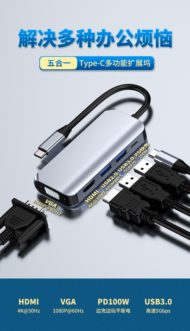 • HDMI + VGA + USB3.0 + USB2.0 + PD (하나로 5 개)