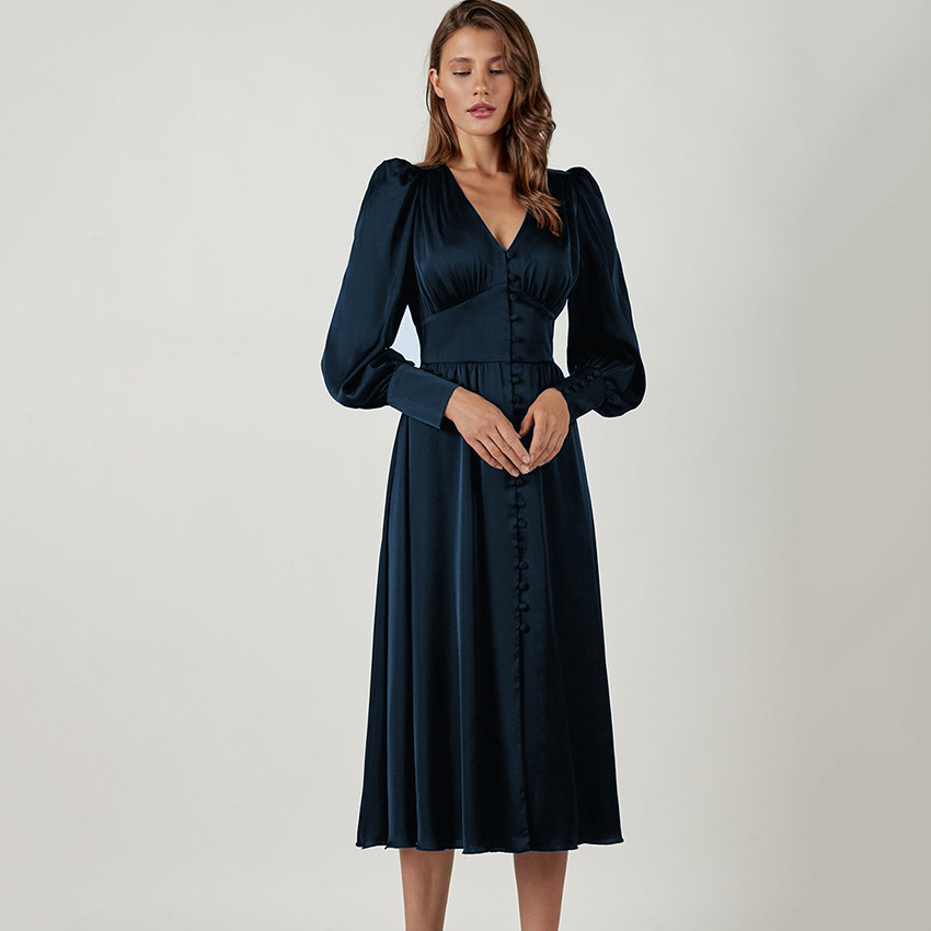 2025 봄 신상 여성용 새틴 드레스, 랜턴 슬리브, 허리 슬리밍, 유럽과 미국 스타일의 슬림 롱 스커트스토어 가기