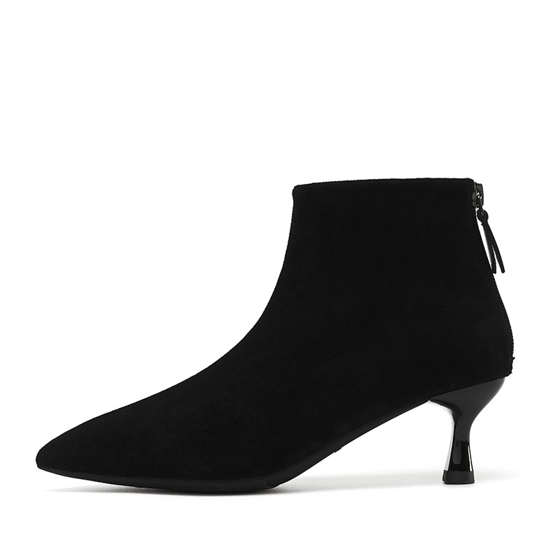 2021 봄과 가을 가죽 블랙 뾰족한 스몰 힐 여성 가을과 겨울 싱글 부츠 미들 힐 백 지퍼 얇은 부츠 블랙 쇼트 부츠