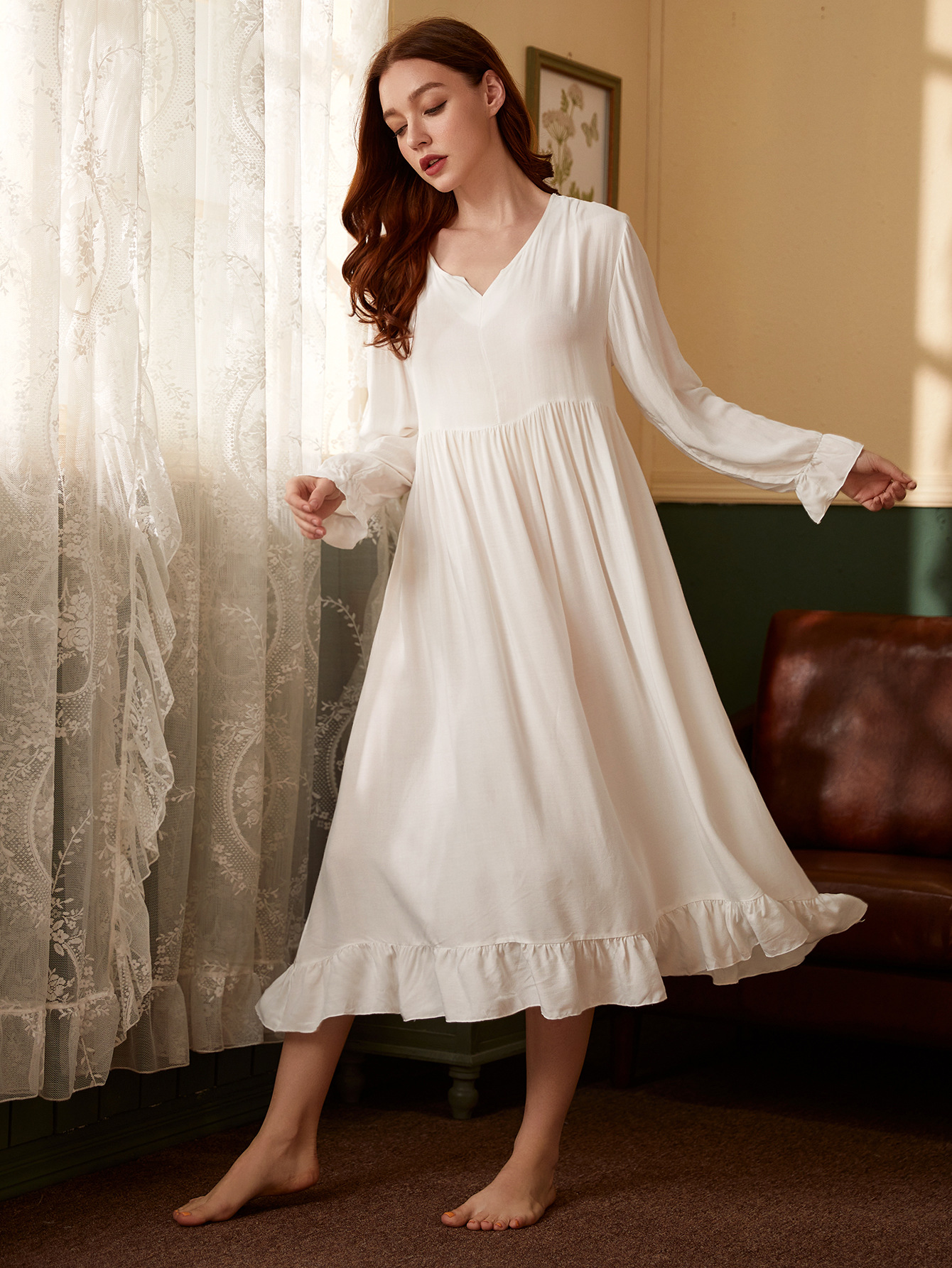 白色睡裙女装春秋新款公主风长袖睡衣花边领法式睡衣长款女