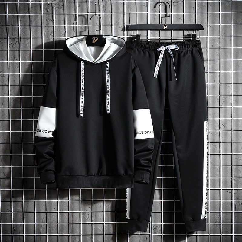 니트 슈트 크로스 보더 남성 가을 폴라 플리스 후드 티셔츠 투피스 세트 한국 스타일 슬림 피트 크롭 팬츠 스포츠스토어 가기