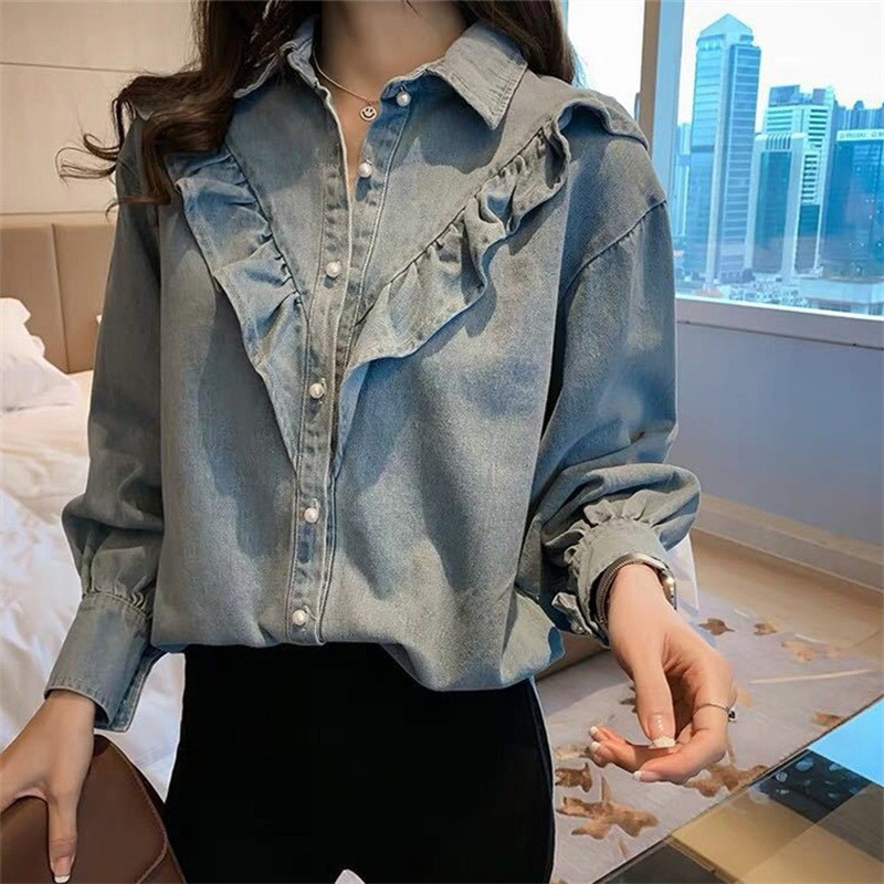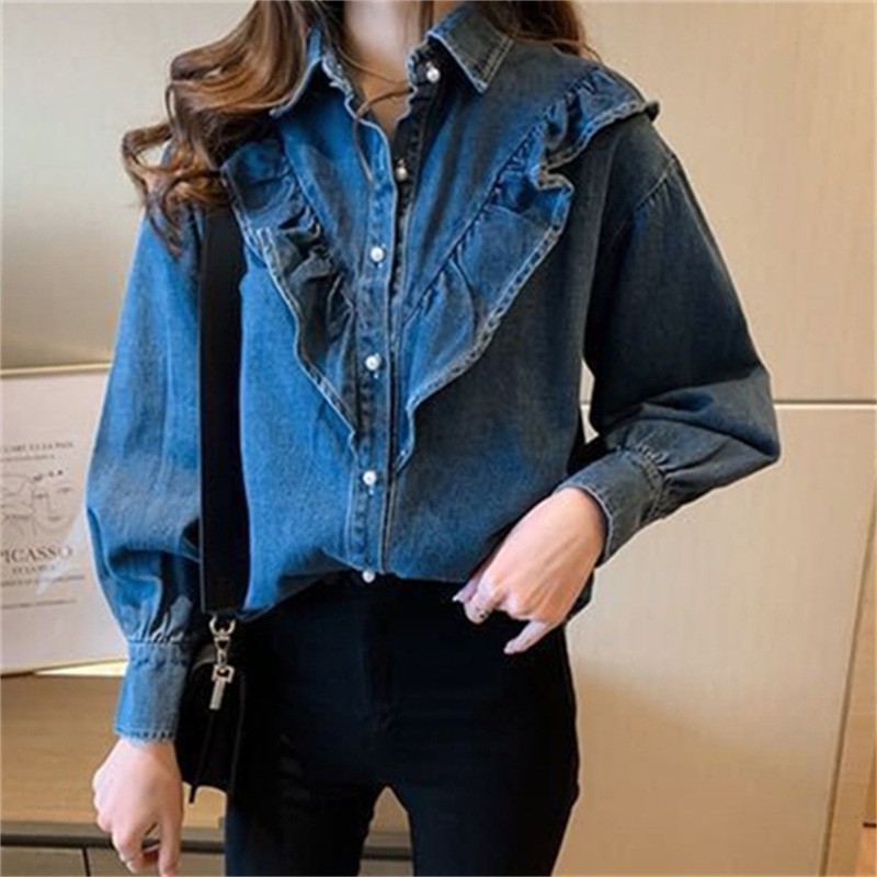 봄 새로운 한국 스타일 달콤한 러플 데님 셔츠 여성의 느슨한 슬리밍 긴팔 탑 트렌디 베이스 셔츠스토어 가기
