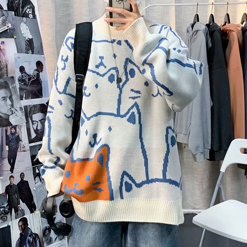가을과 겨울 새로운 만화 고양이 크루넥 스웨터 남자의 느슨한 커플 니트 스웨터 학생 한국 스타일 유행 캐주얼 재킷스토어 가기