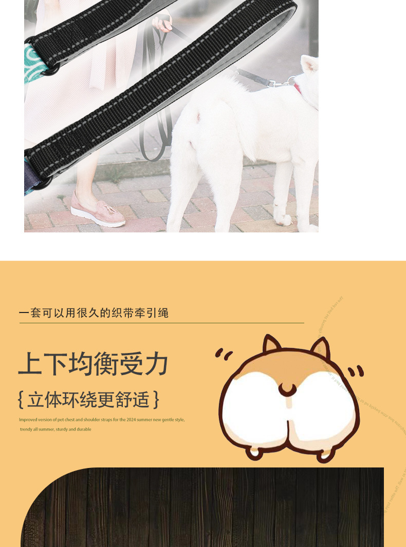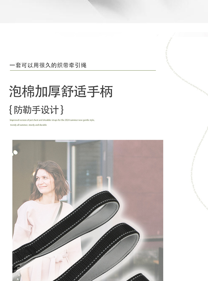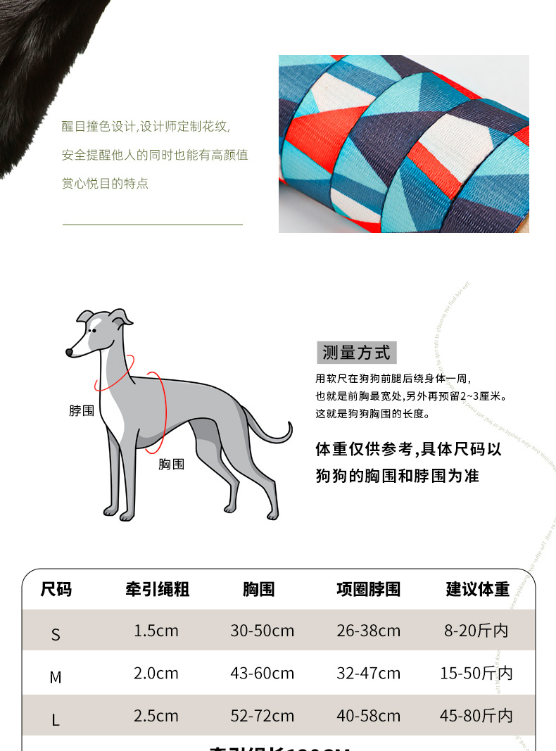 【优点】多花色可选,材质舒适不伤狗,执手夜间反光内衬潜水布料,遛狗不伤手