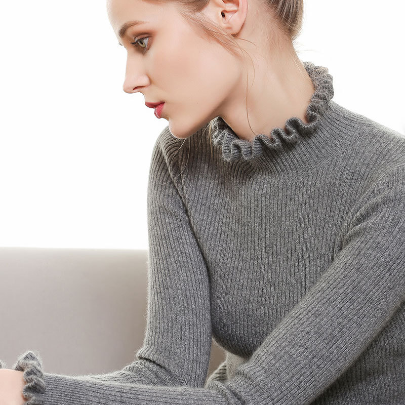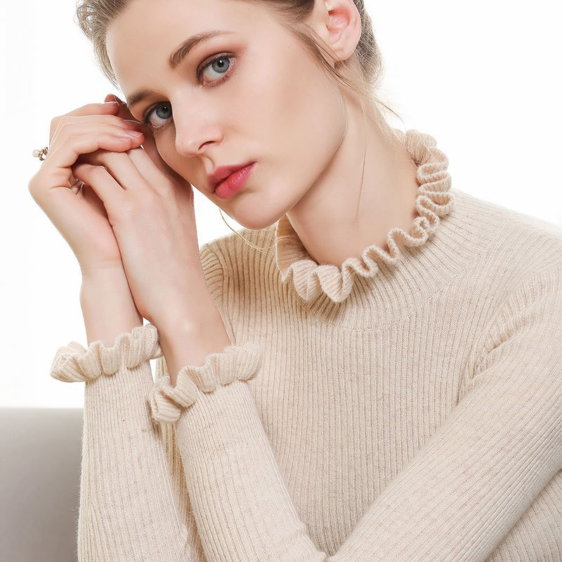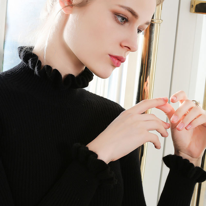 半高领羊绒衫女套头木耳领花边袖羊毛衫短款紧身打底毛衣女秋冬