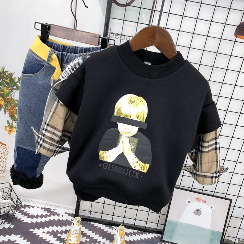 어린이 겨울 기모 운동복 한국식 소년 만화 양털 따뜻한 가짜 투피스 겨울 최고 캐주얼