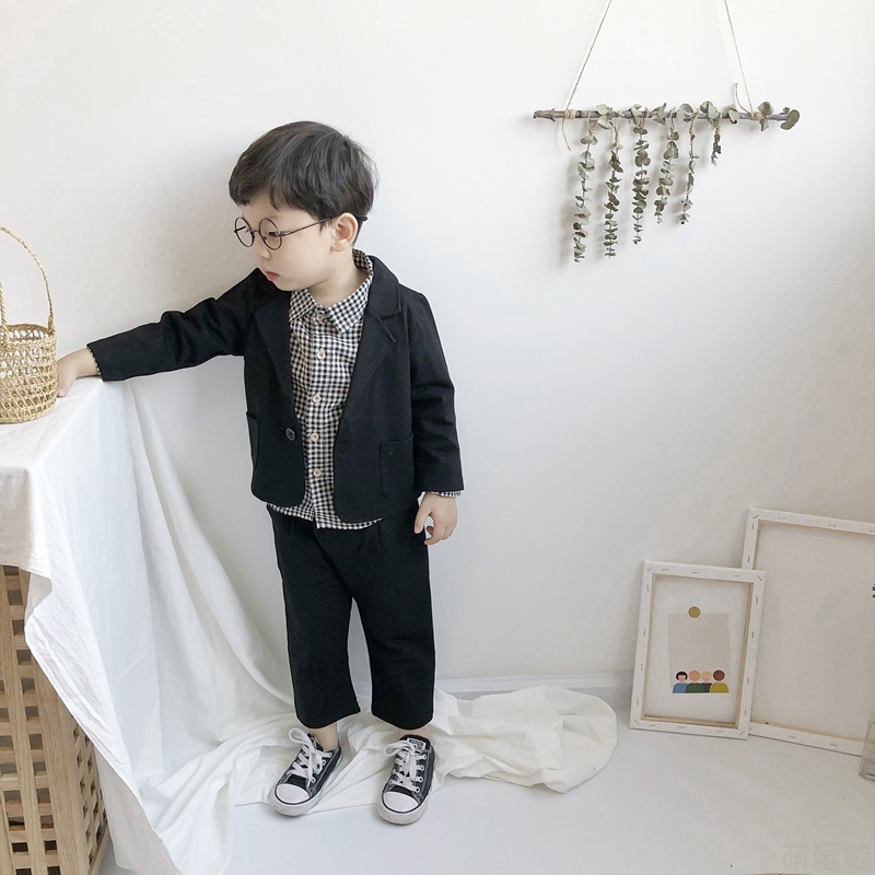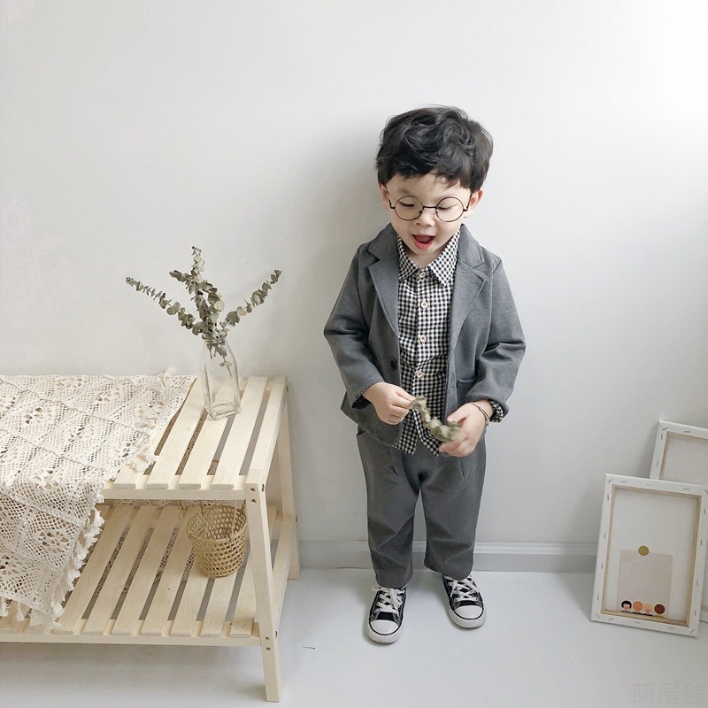 남아 아동복 한국 스타일 어린이 가을 체크 셔츠 긴팔 정장 재킷 싱글 버튼 정장 아동복 세트