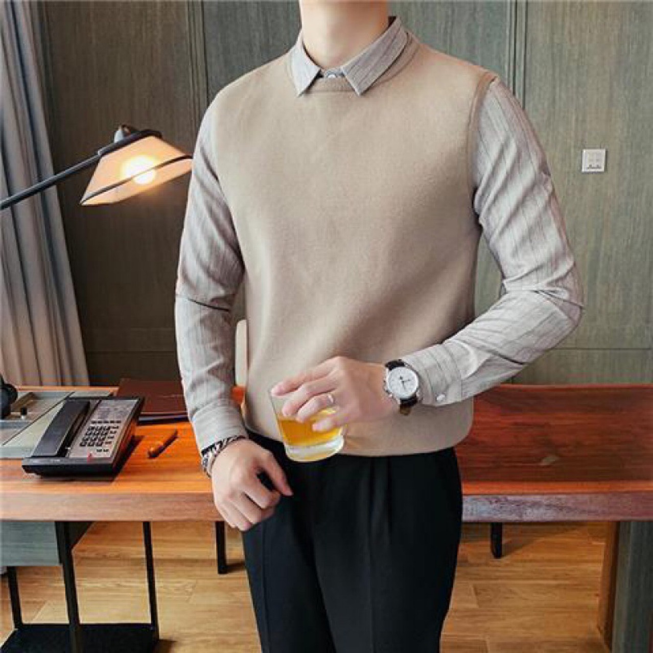 겨울 기모 크루넥 가짜 투피스 셔츠 칼라 스웨터 남자의 가을 유행 캐주얼 한국 스타일 긴팔 일반 스웨터