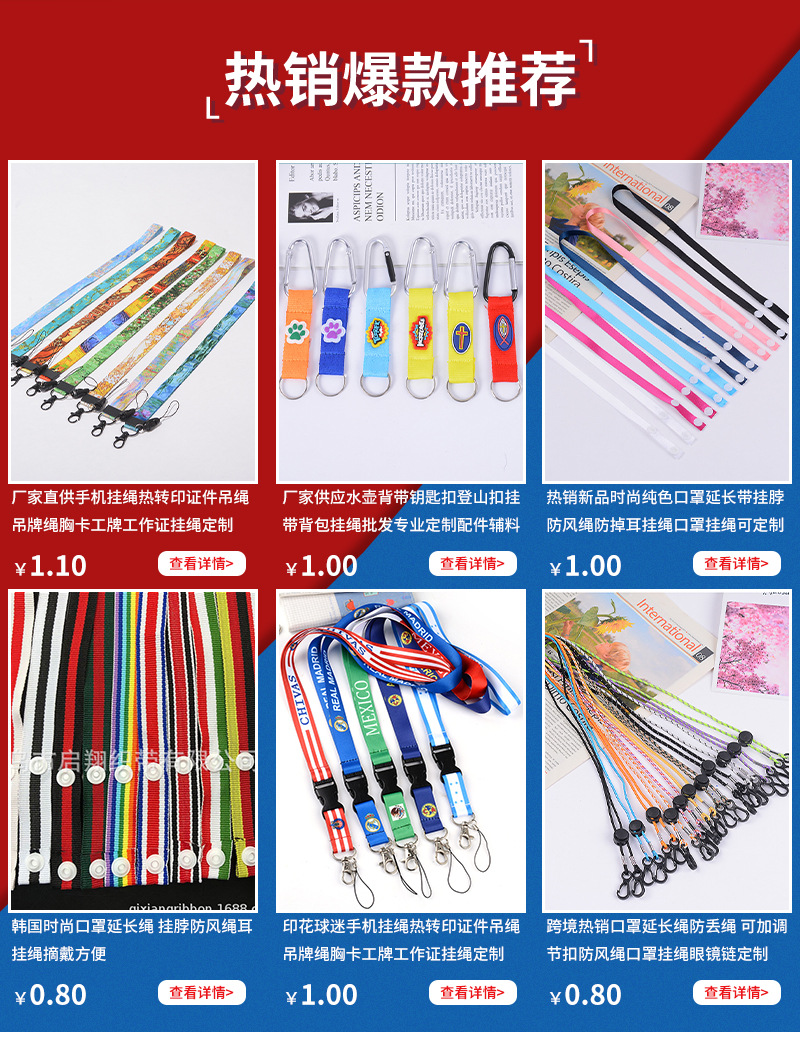 ==购买须知== 【关于购买】本公司专业生产各种证件挂绳,手机挂带,高中档鞋带,箱包行李带,登山扣钥匙圈挂带,商品工艺多样、制作精美,货源充足,购买之前请先询问您需要的商品的相关规格,为了给您优质的服务,问题请尽可能客观、简洁。网上订购请先与我们客服联系确认无误再拍 【关于图片】图片100%实物拍摄,但图片及信息仅供参照,商品将以实物为准。如您来图来样订做,请传清晰图片,并附上配件与规格的说明。