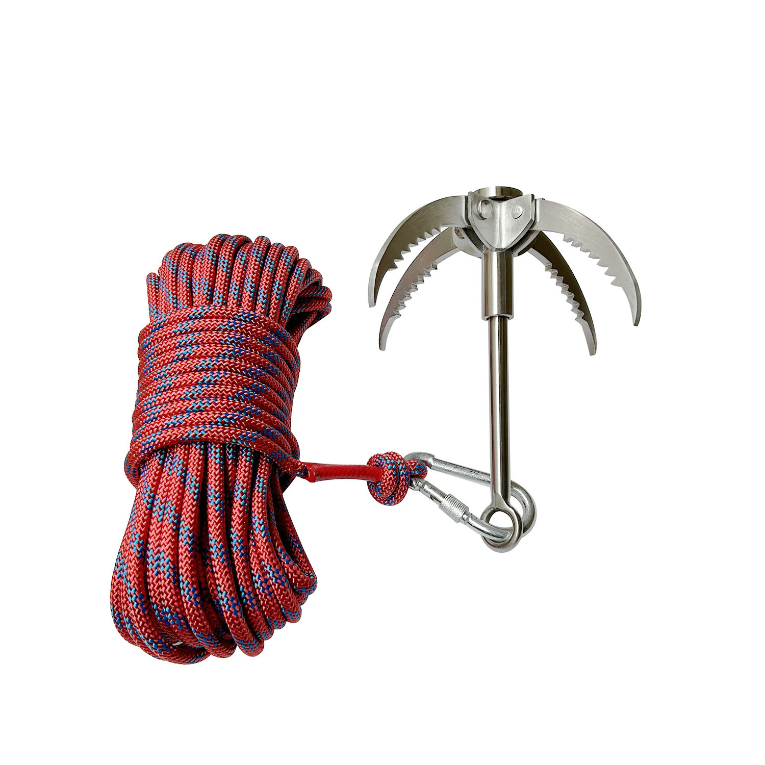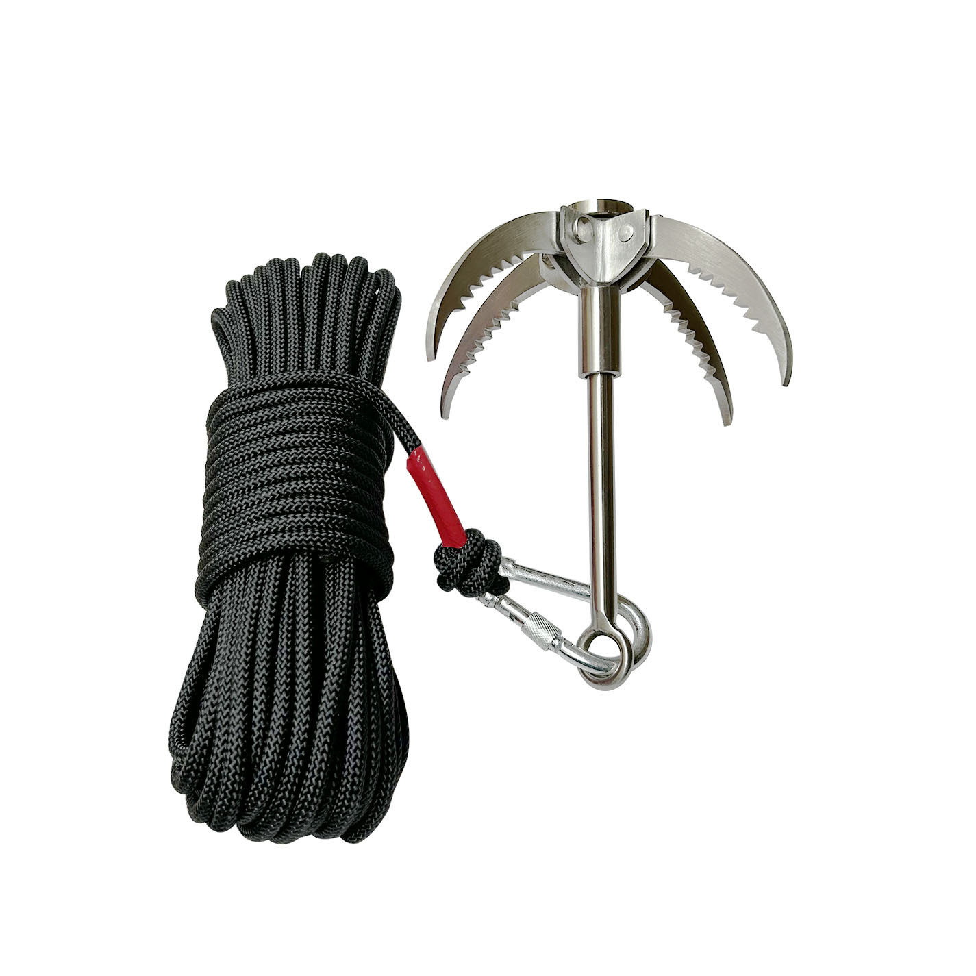 材质:304不锈钢 ,尼龙登山绳 (直径0.8CM,长20米),金属快挂