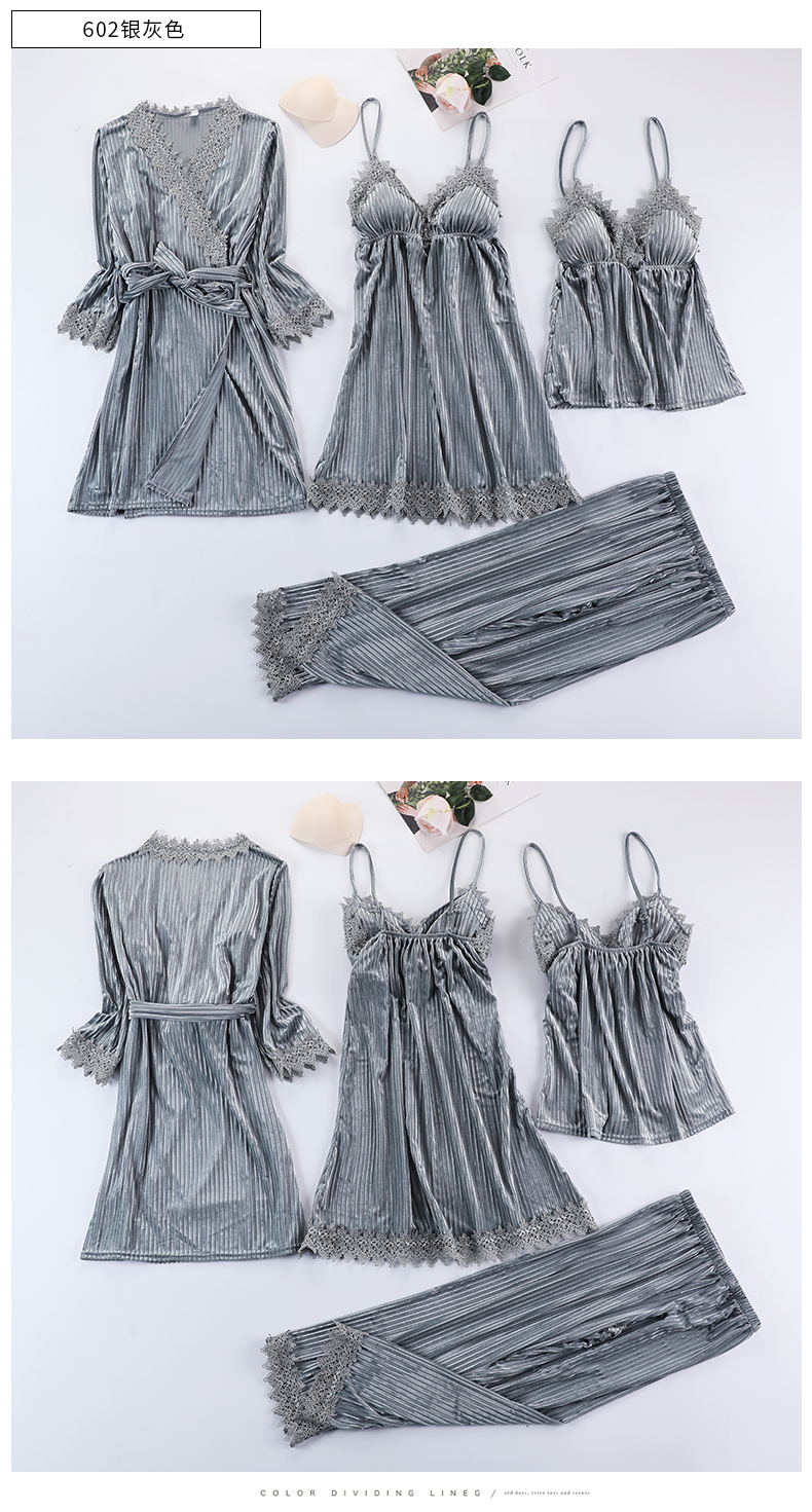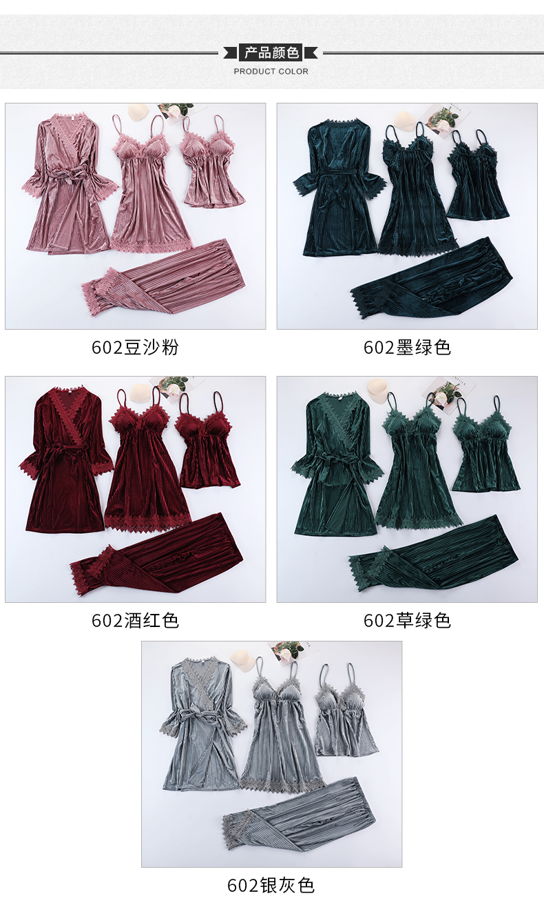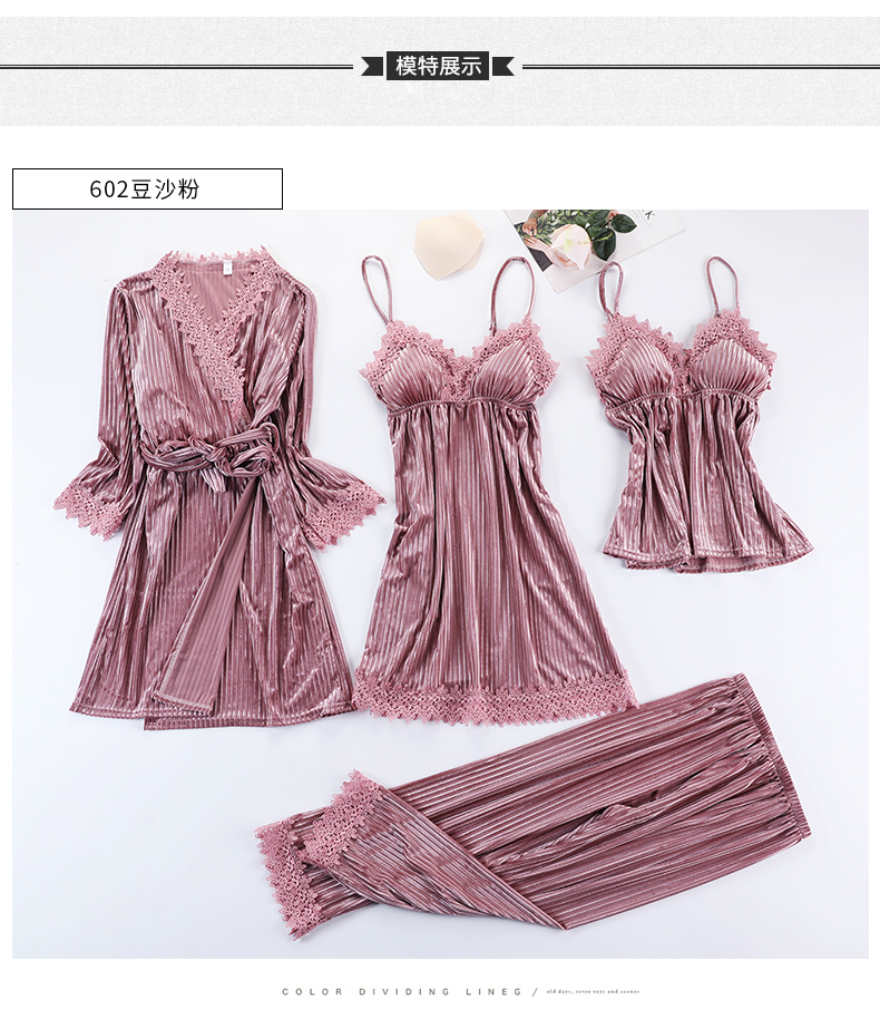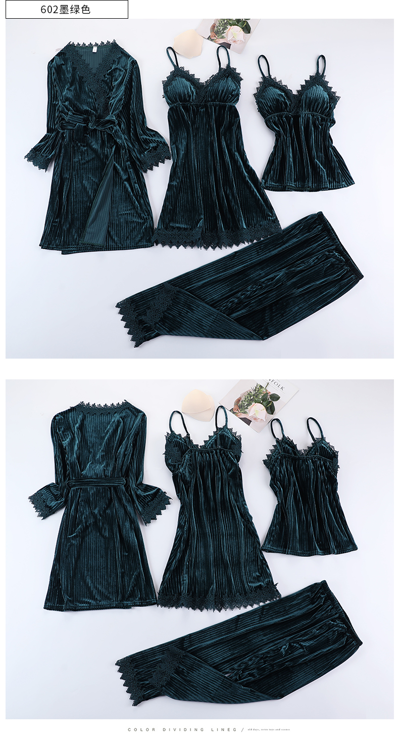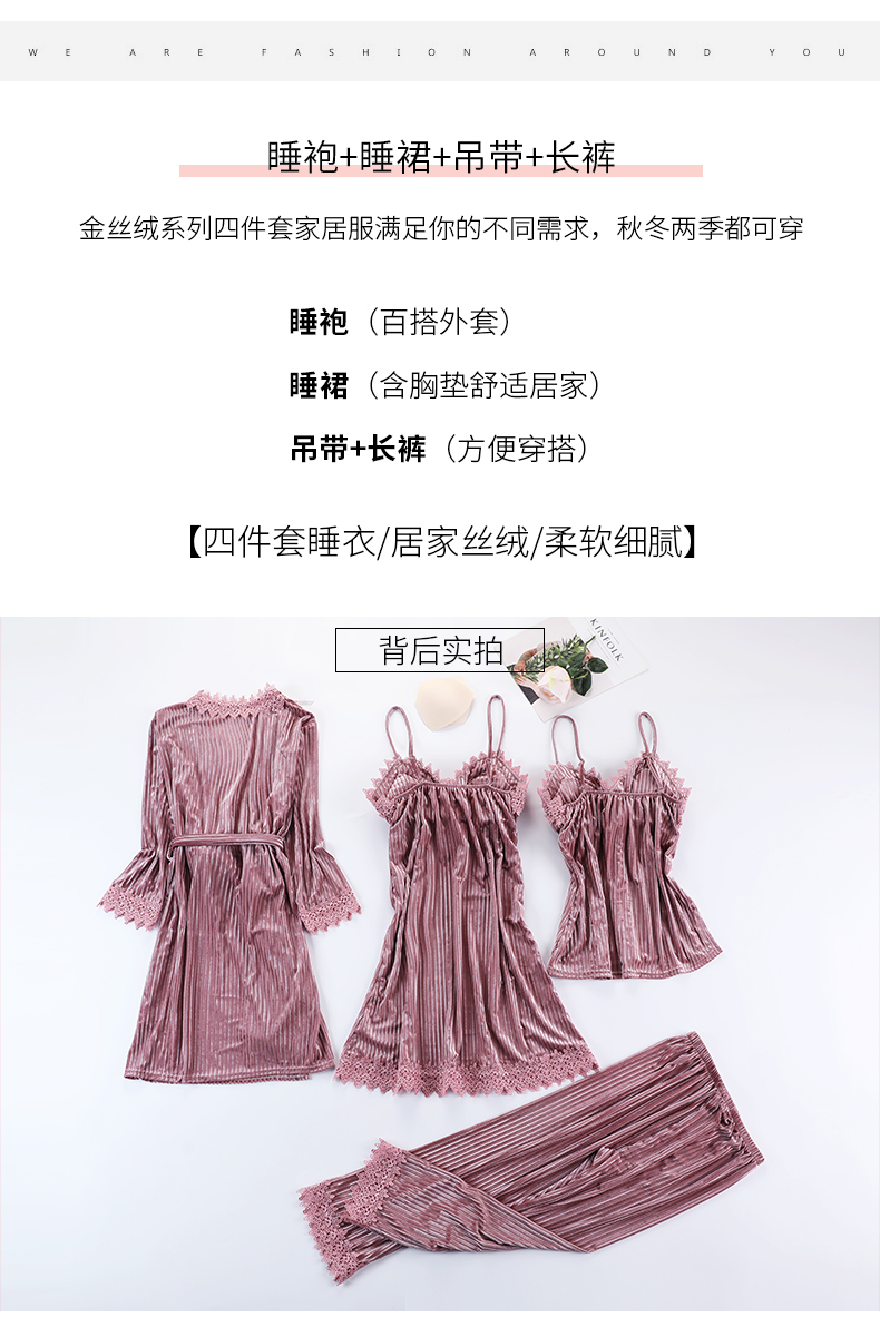 골든 벨벳 잠옷 여자의 봄과 가을 섹시한 잠옷 슬링 벨트 가슴 패드 4 종 세트 잠옷 겨울 가정복 세트
