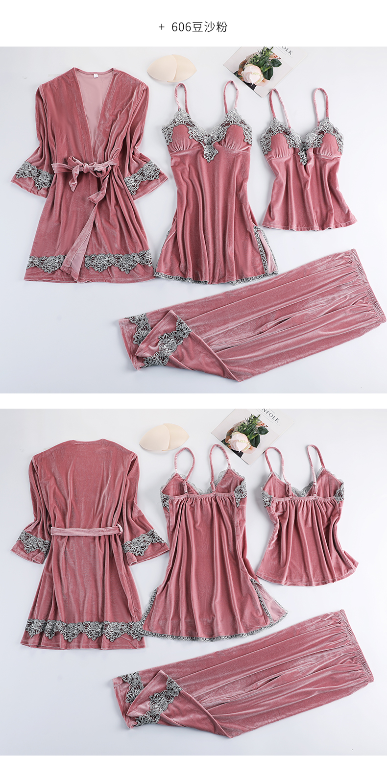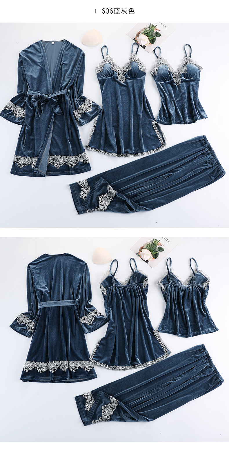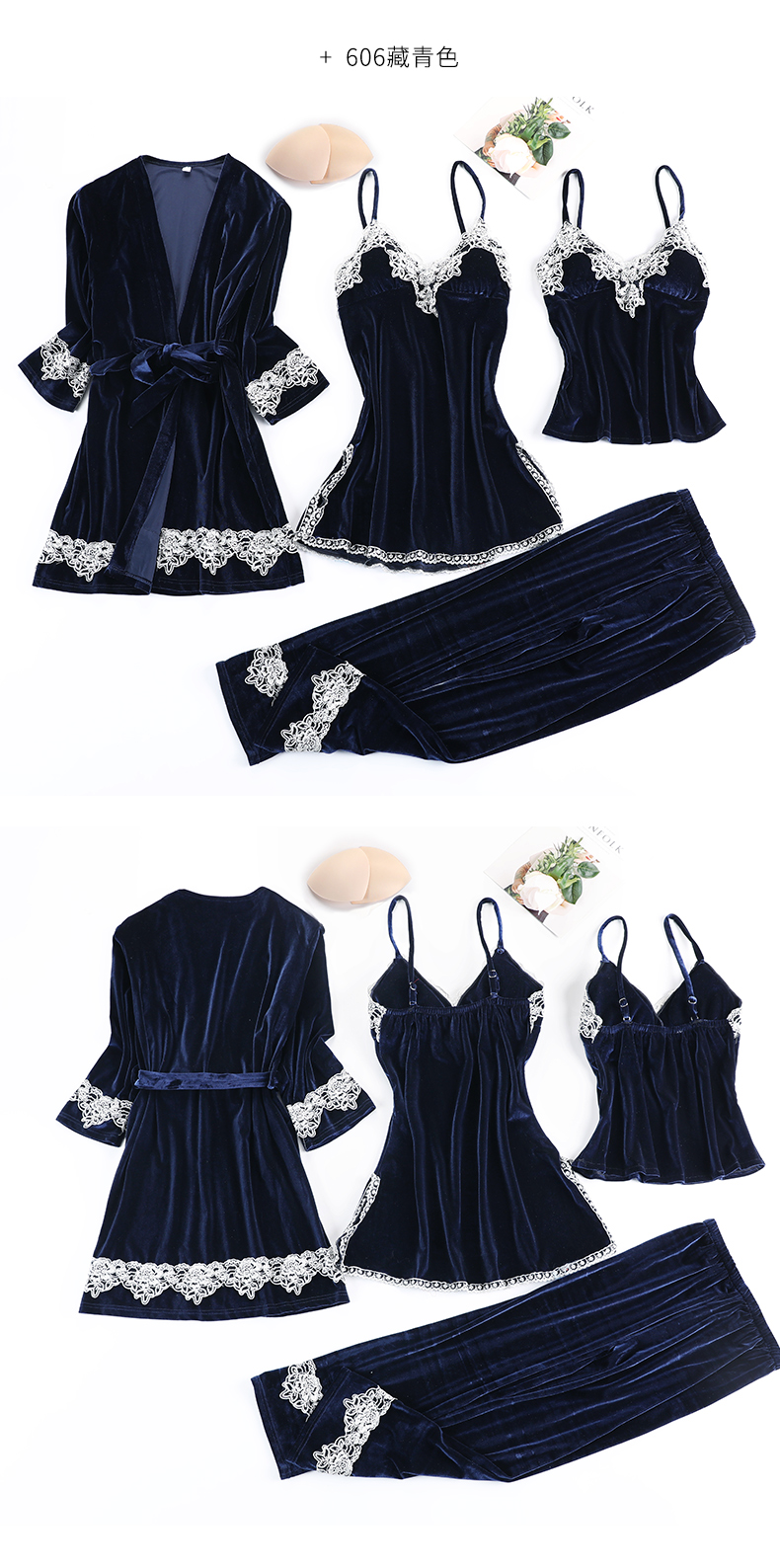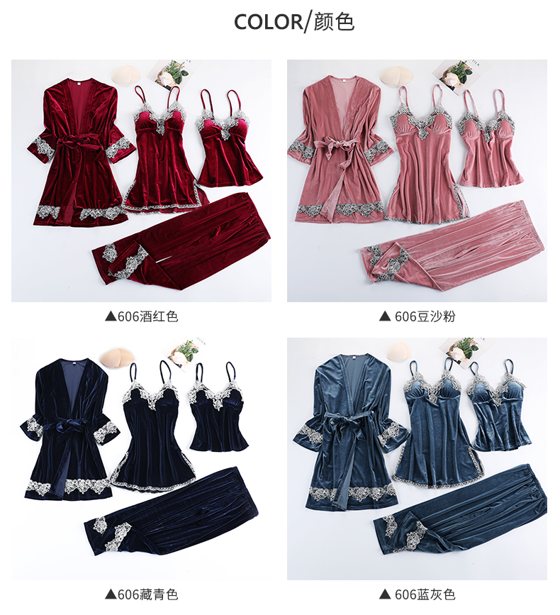 골든 벨벳 잠옷 여자의 봄 가을과 겨울 섹시한 잠옷 슬링 스트랩 가슴 패드 레이스 여자의 가정 옷 4 피스 세트