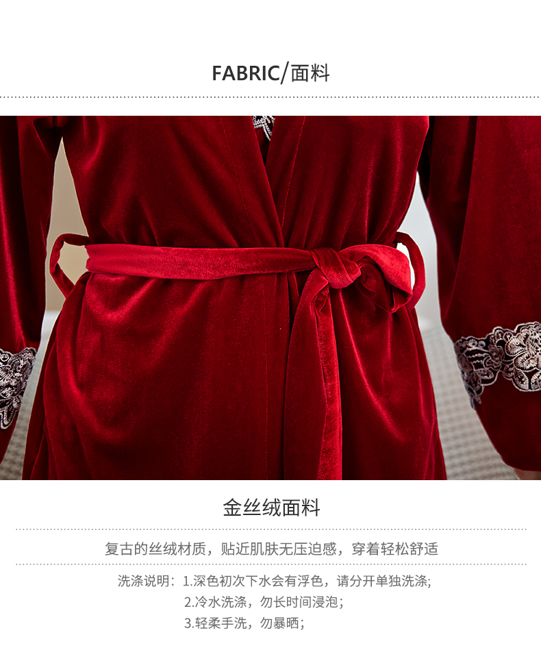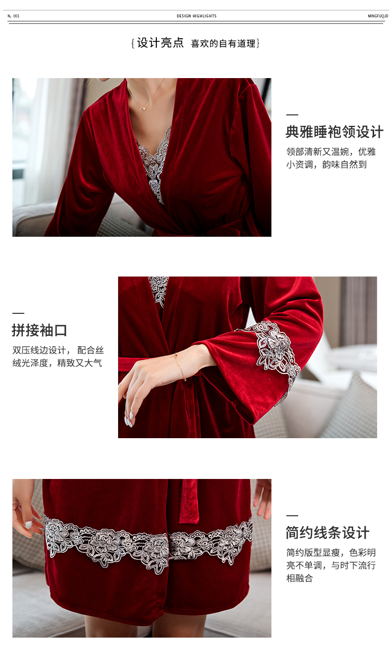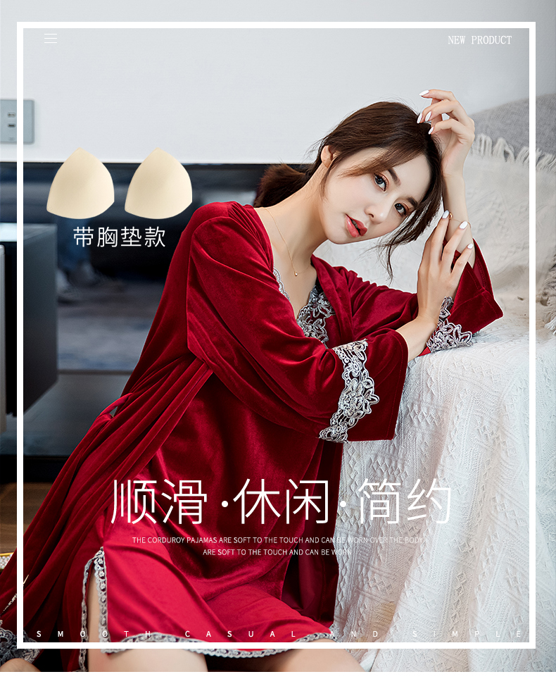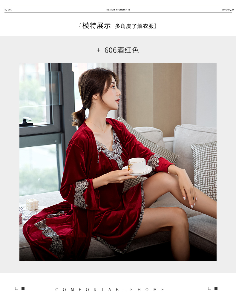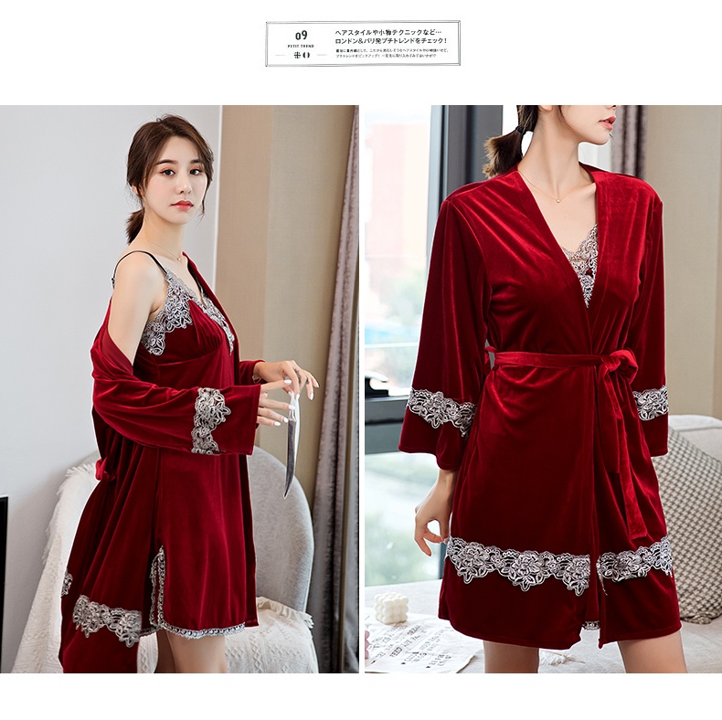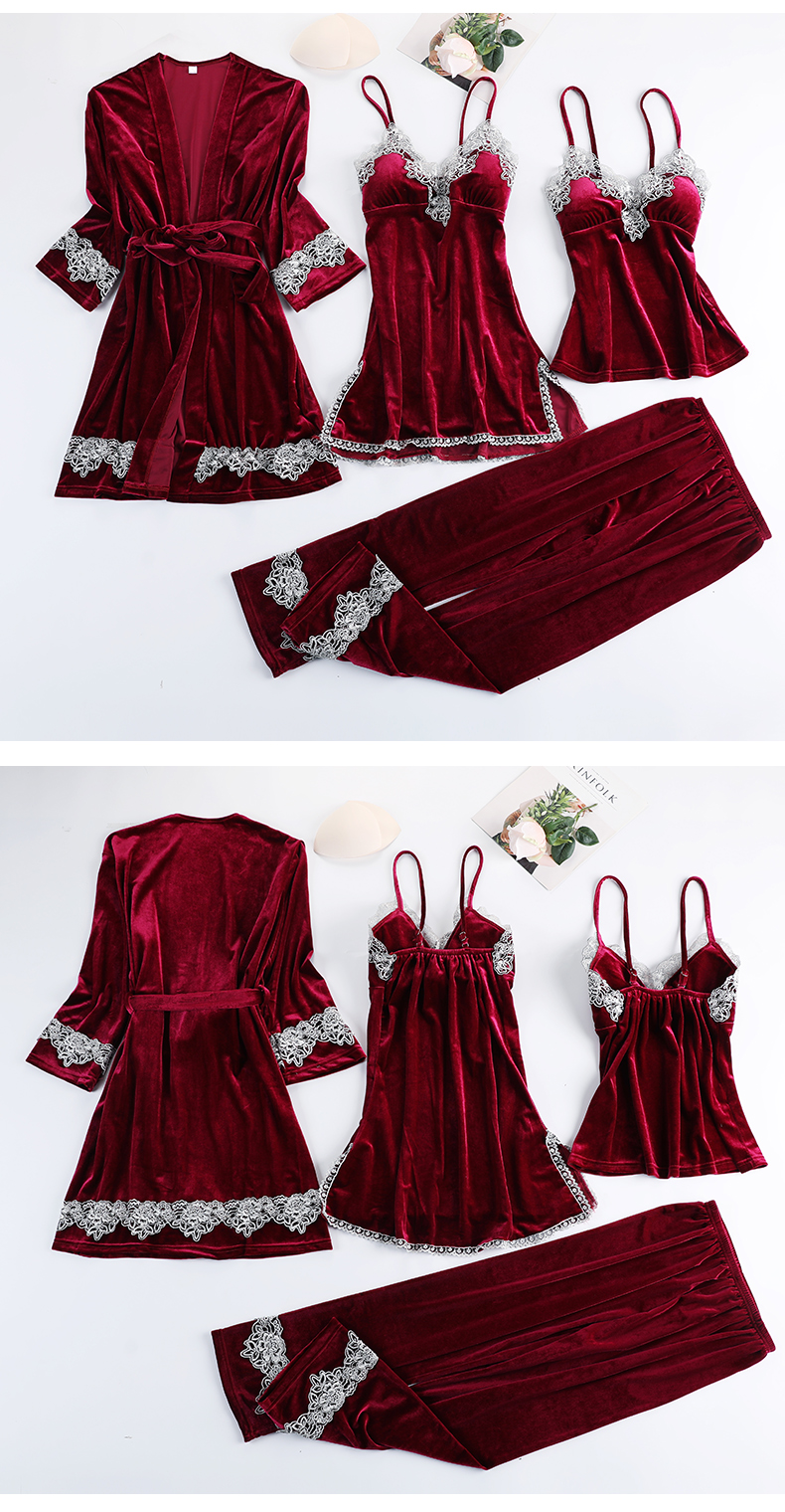 골든 벨벳 잠옷 여자의 봄 가을과 겨울 섹시한 잠옷 슬링 스트랩 가슴 패드 레이스 여자의 가정 옷 4 피스 세트