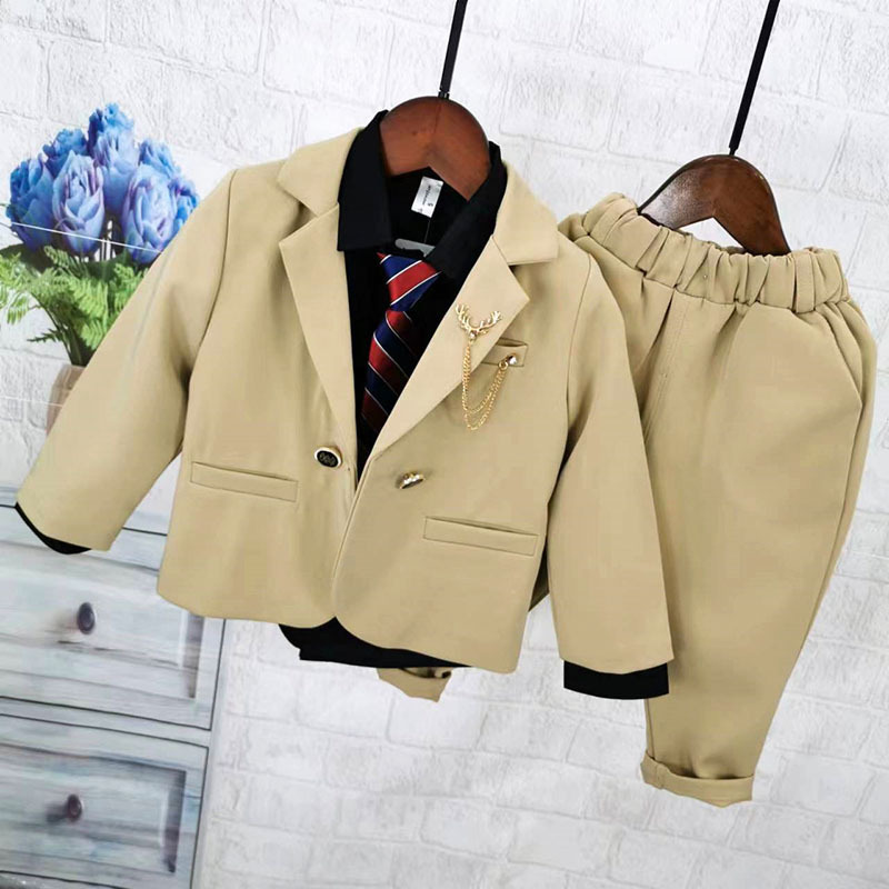 • 0023 카키 투피스 슈트 + 블랙 셔츠 (블루 & 레드 타이 싱글 사슴 머리 체인 포함)