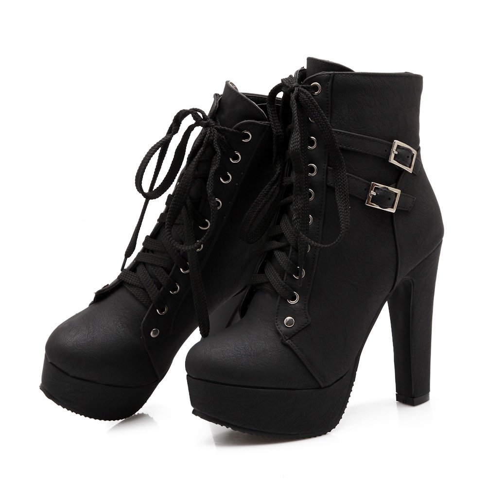 새로운 대외 무역 하이힐 두꺼운 굽 라운드 헤드 벨트 버클 부츠 패션 여성 신발 블랙