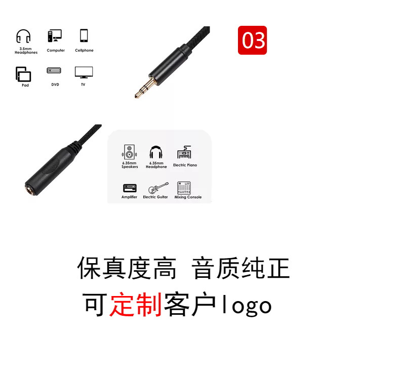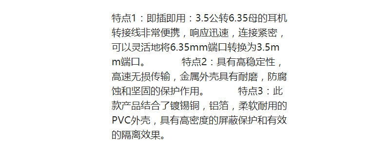 双层屏蔽:此6.35母转3.5公转接线结合了镀锡铜,铝箔,柔软耐用的PVC外壳,具有高密度的屏蔽保护和有效的隔离效果,可提供完整细腻的音调,并具有的恢复音质。