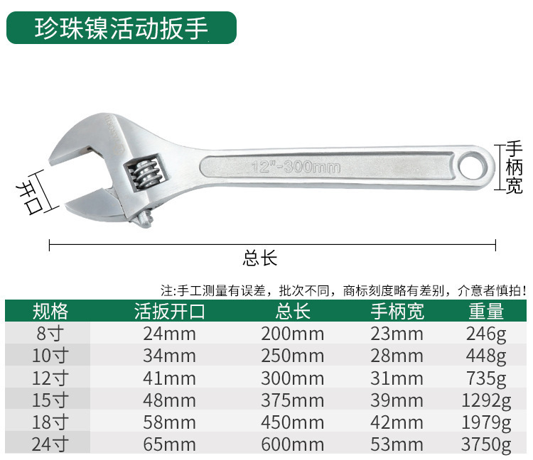 진주 니켈 조절식 렌치, 파이프 및 조절식 겸용, 넓은 개구부, 욕실용 플라스틱 손잡이, 두꺼운 전면 연마형, 조절 가능, 내구성 강함스토어 가기