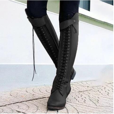 2019 새로운 유럽 및 미국 대외 무역 부츠 무릎 부츠 리벳 레이스 두꺼운 뒤꿈치 라운드 헤드 나이트 부츠 수출스토어 가기