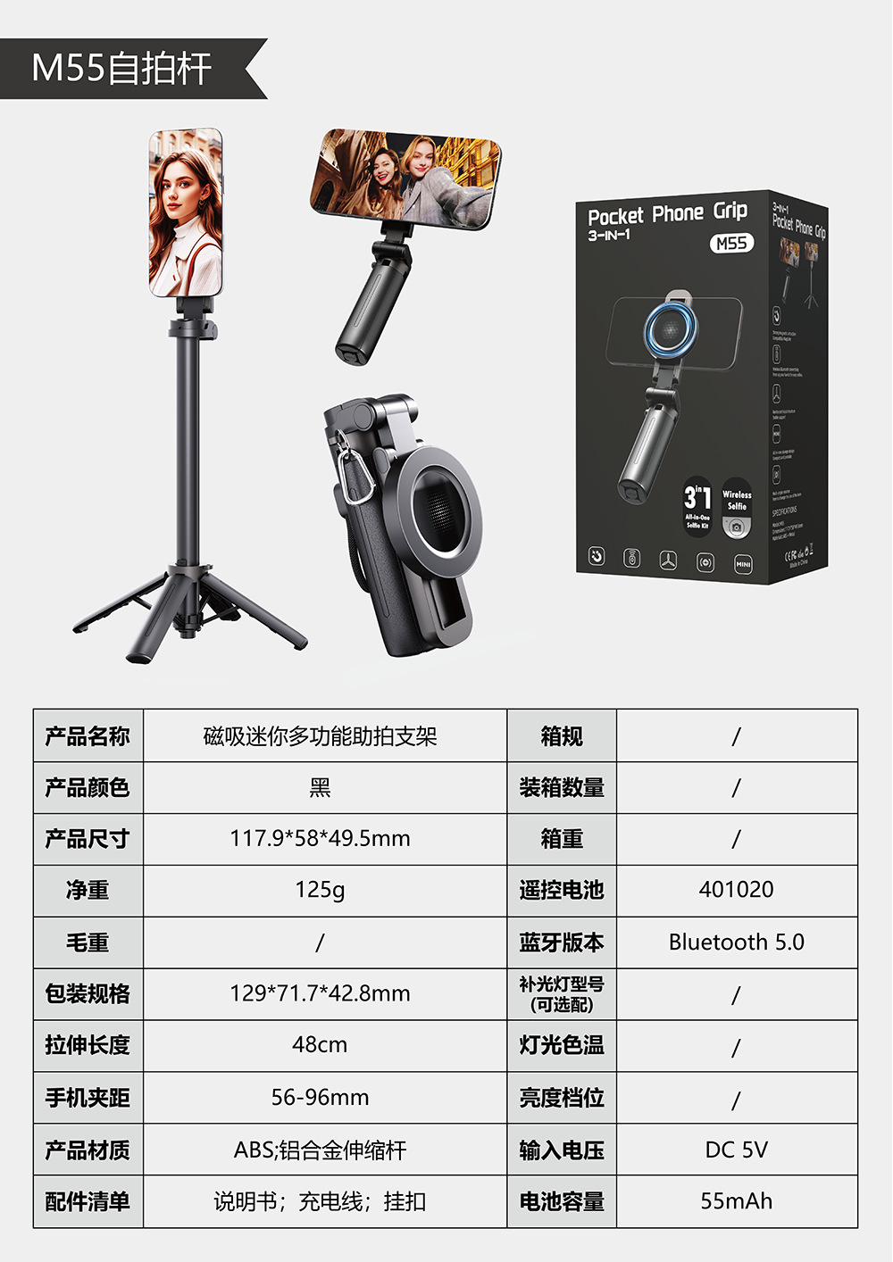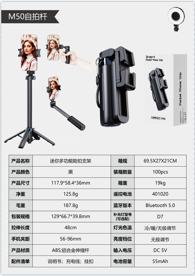 • M50+D10 싱글 뷰티 라이트 미니 셀카봉 블랙