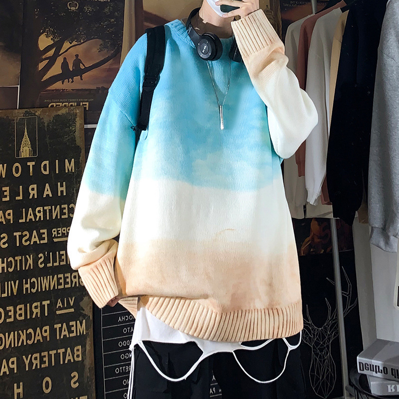 라운드 넥 스웨터 남성용 가을과 겨울 느슨한 대비 색상 그라디언트 스웨터 한국식 트렌디 홍콩 스타일 풀오버 스웨터스토어 가기