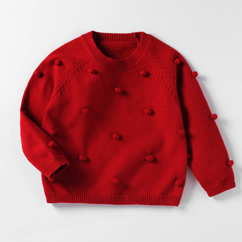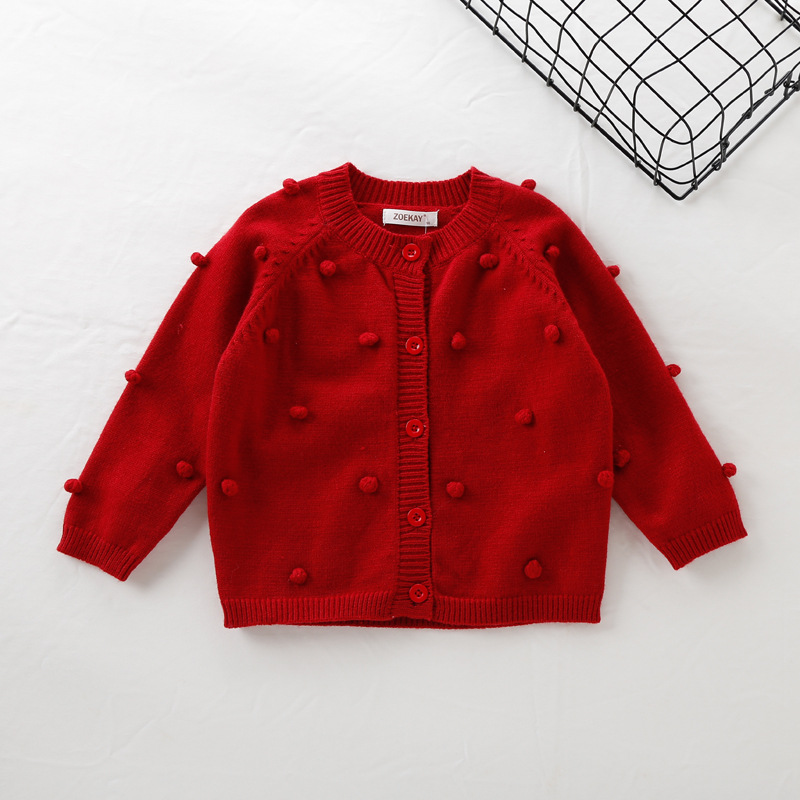 여아용 스웨터 아동복 도매 수제 볼 장식 긴팔 빨간색 아동 스웨터 가디건 유아용 세련된 니트 코트