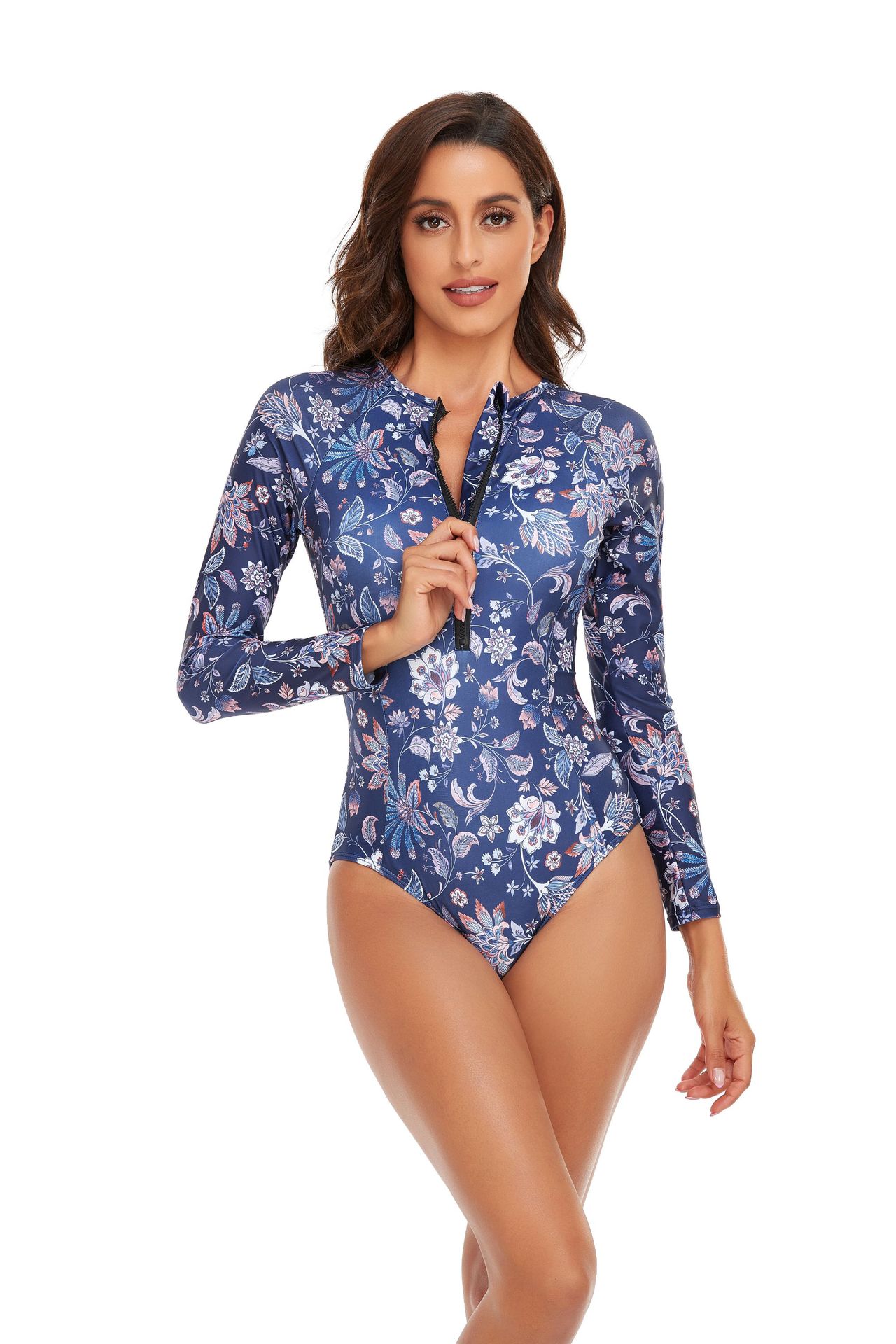 새로운 유럽과 미국의 원피스 수영복 여성 긴 소매 스포츠 솔리드 컬러 스티치 수영복 아마존 여성 서핑 슈트 도매스토어 가기