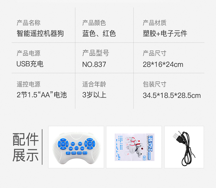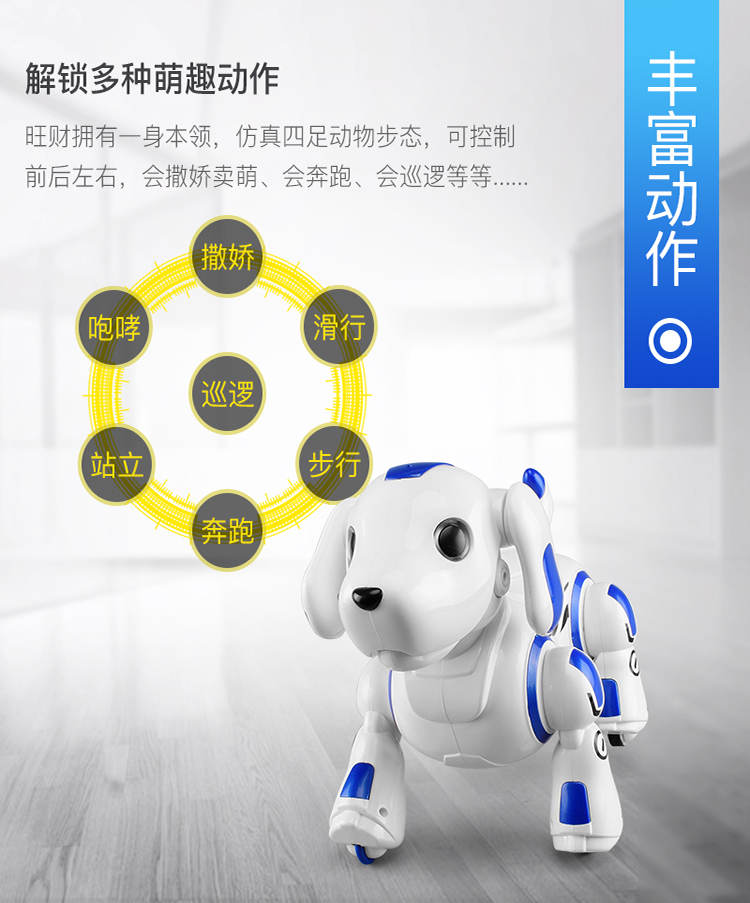 | 功能:前进,后退,左转,右转,步行前进,奔跑,咆哮,巡逻,唱歌,跳舞,音量控制,编程,模仿动物叫声,乐器声,眼睛变色。 |