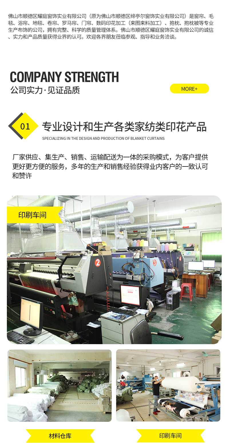 佛山市顺德区耀庭窗饰实业有限公司(原为佛山市顺德区缔亭尔窗饰实业有限公司)是窗帘、毛毯、浴帘、地毯、卷帘、罗马帘、门帘、数码印花加工(来图来料加工)、抱枕、抱枕被等专业生产布饰的公司,拥有完整、科学的质量管理体系。佛山市顺德区耀庭窗饰实业有限公司的诚信、实力和产品质量获得业界的认可。欢迎各界朋友莅临参观、指导和业务洽谈。