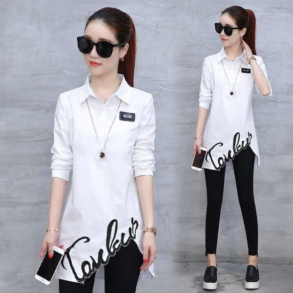 한국식 슬림핏 슬리밍 봄과 가을 중간 길이 비대칭 자수 블라우스 긴팔 셔츠스토어 가기