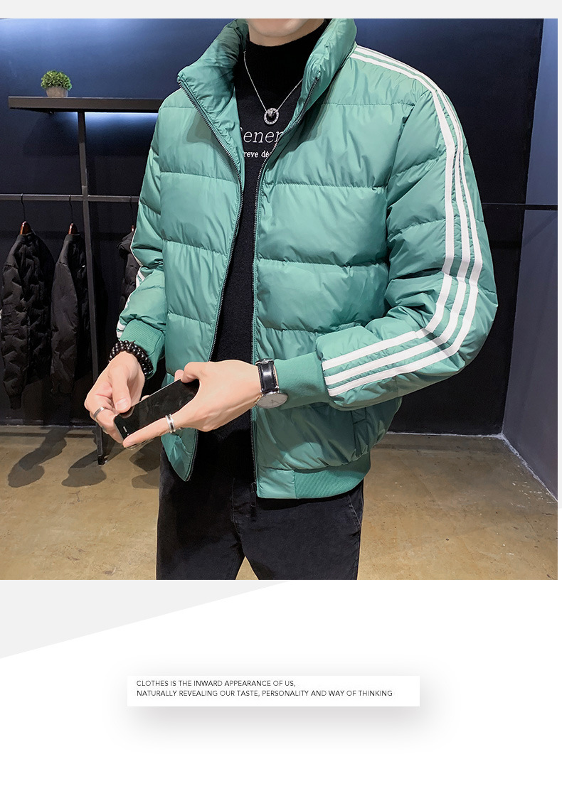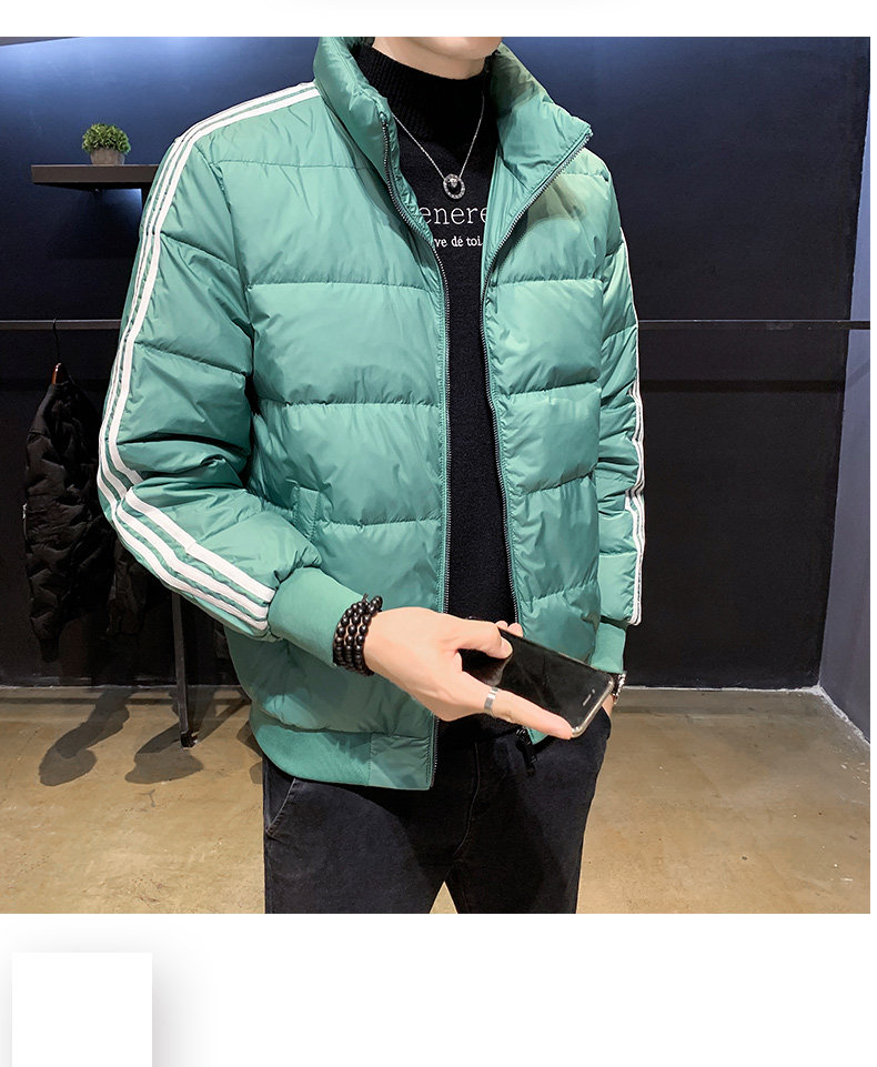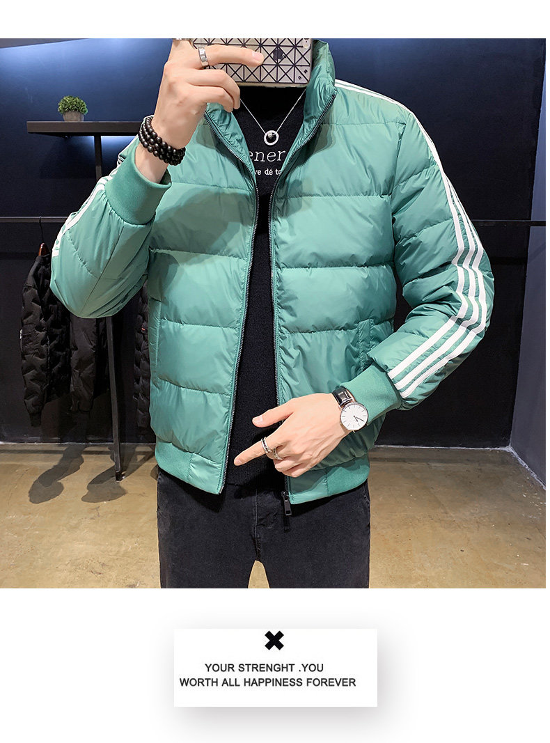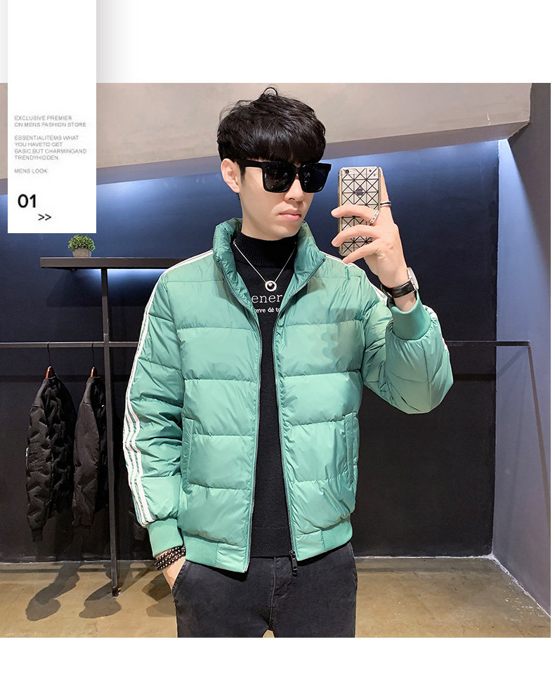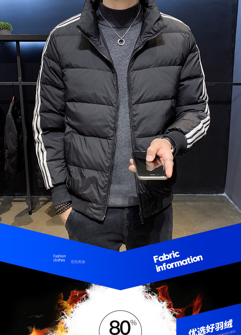 겨울 짧은 남자 남자 한국 캐주얼 스트라이프 다운 재킷 스탠드 칼라 유행 화이트 오리 다운 코트스토어 가기