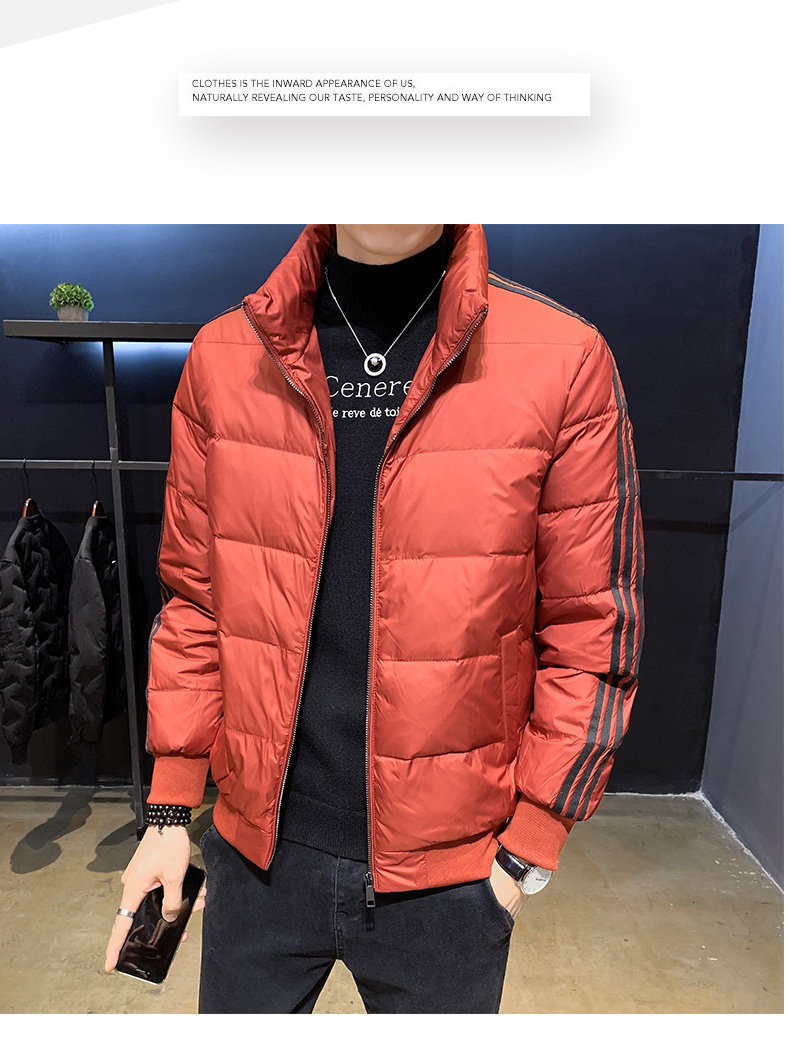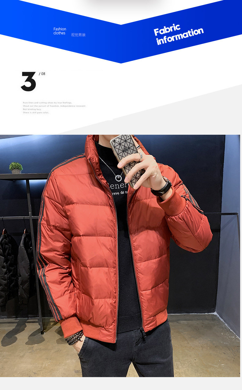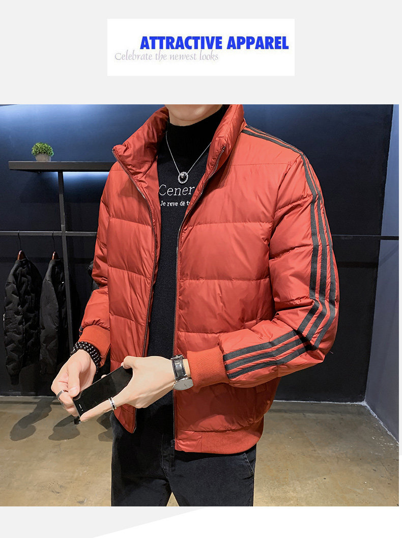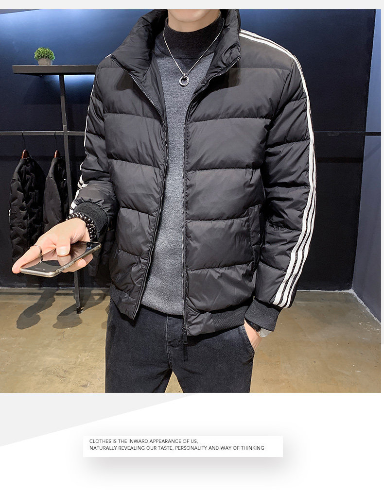 겨울 짧은 남자 남자 한국 캐주얼 스트라이프 다운 재킷 스탠드 칼라 유행 화이트 오리 다운 코트