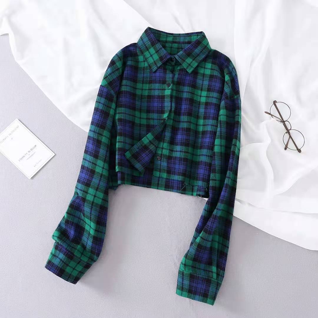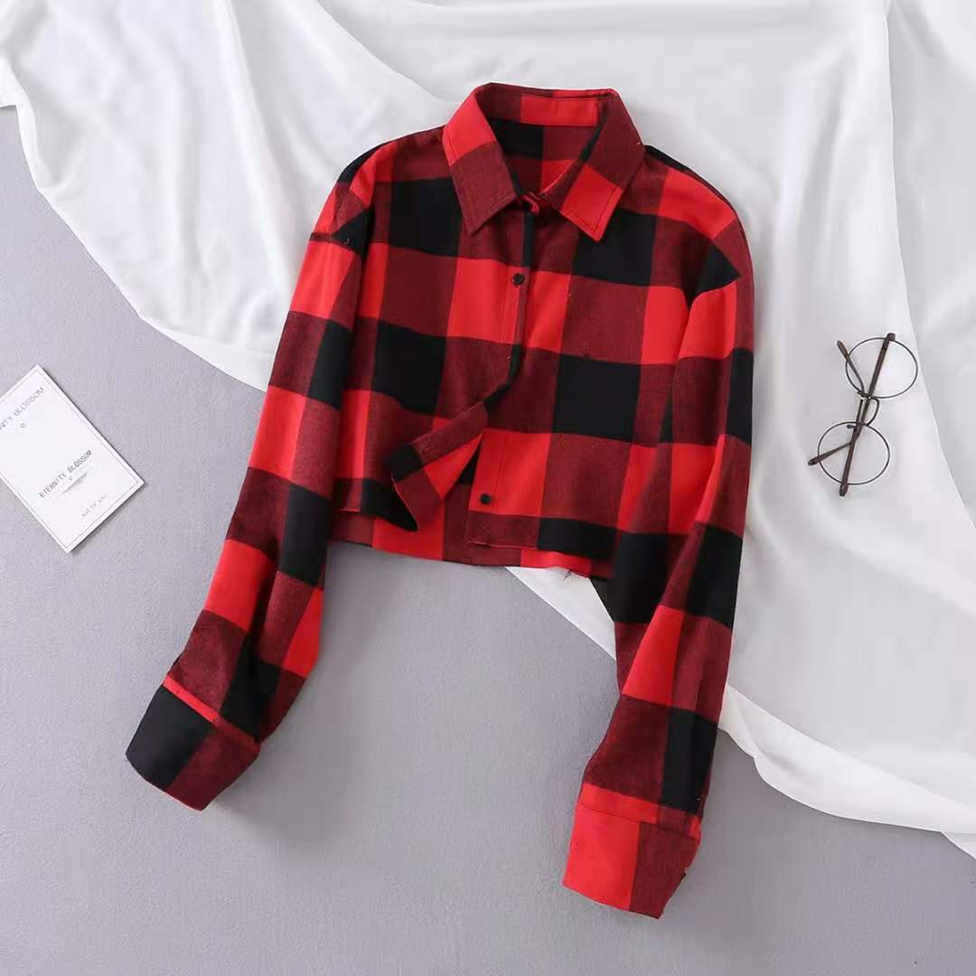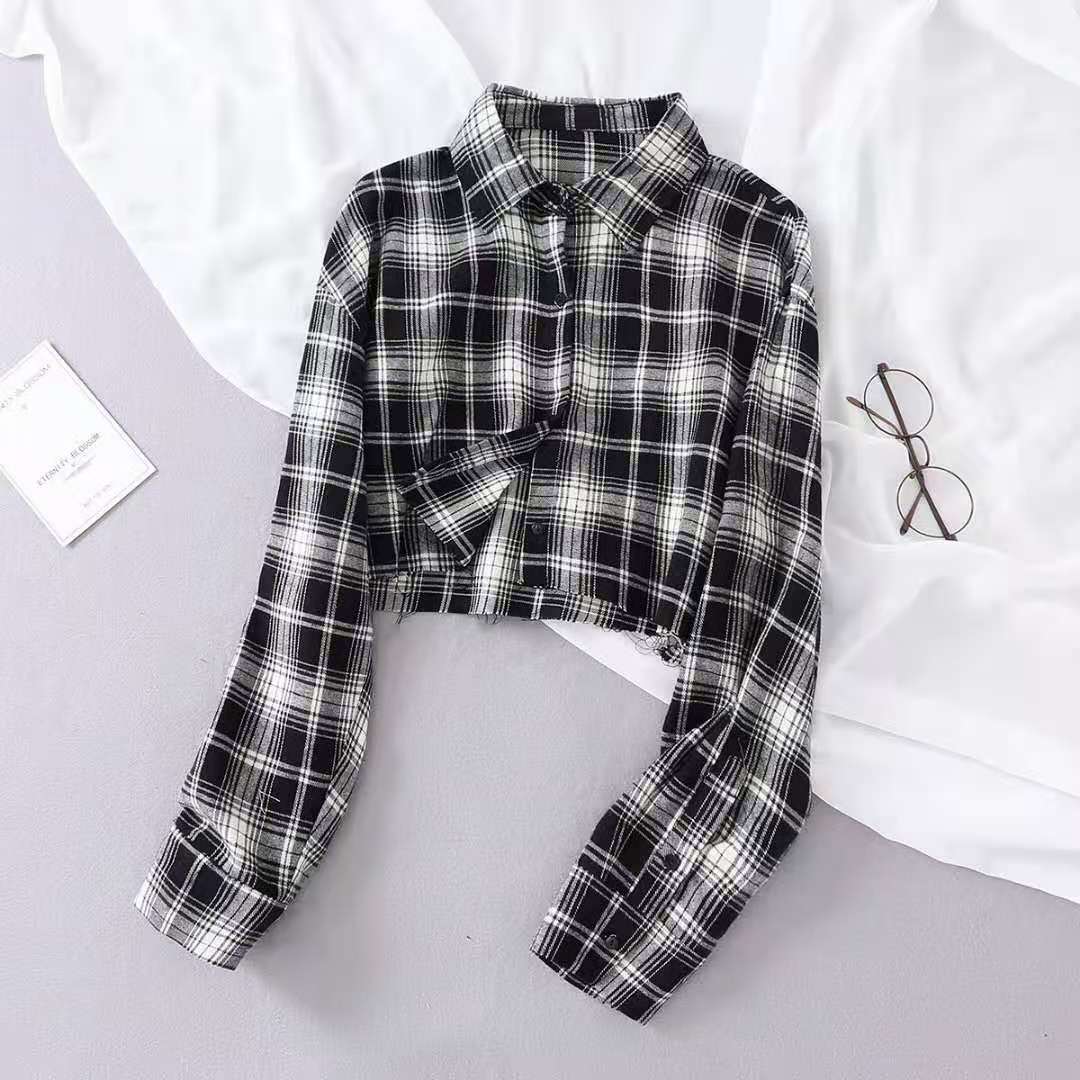 유럽과 미국 AA 스타일 여성 의류 도매 2020 봄 새로운 짧은 옷깃 배꼽 긴 소매 격자 무늬 셔츠 여성