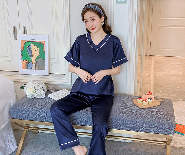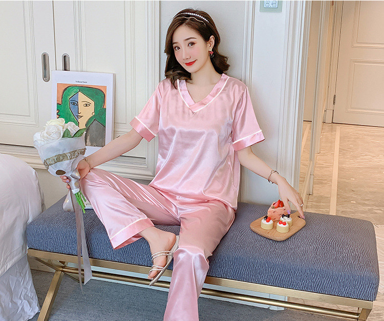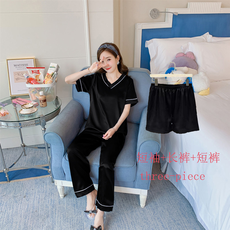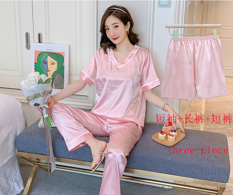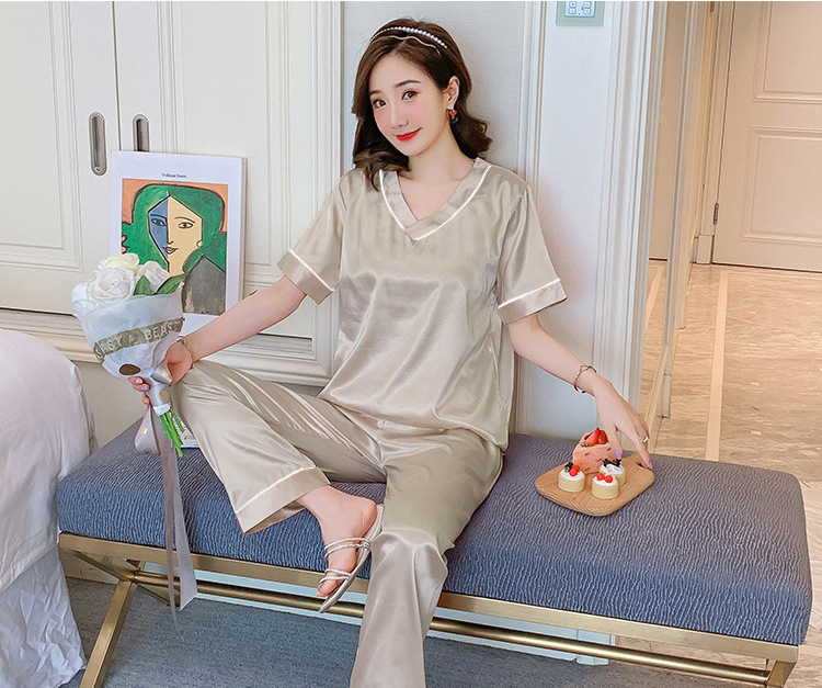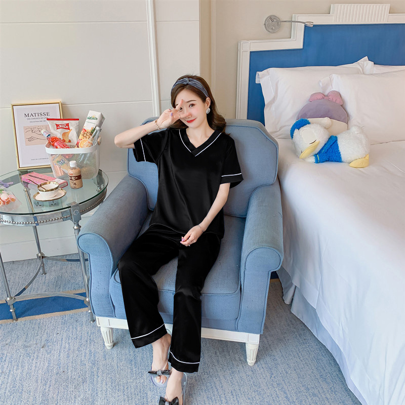 여성용 홈 의류 아이스 실크 반팔 바지 모조 실크 카디건 옷깃 여성용 파자마 단색 봄과 여름 새로운스토어 가기