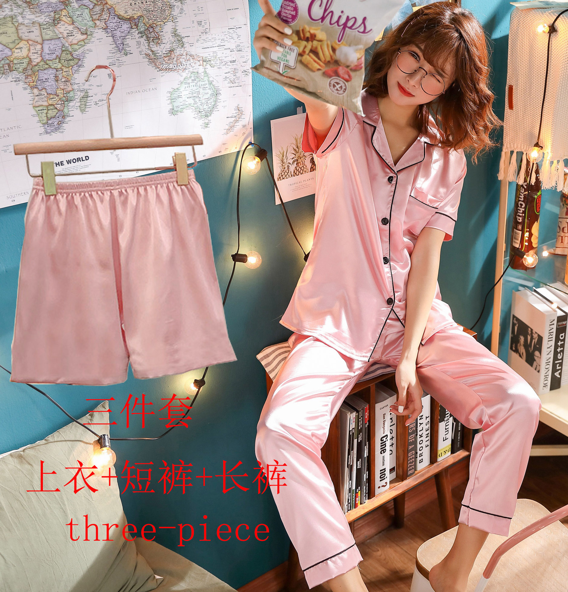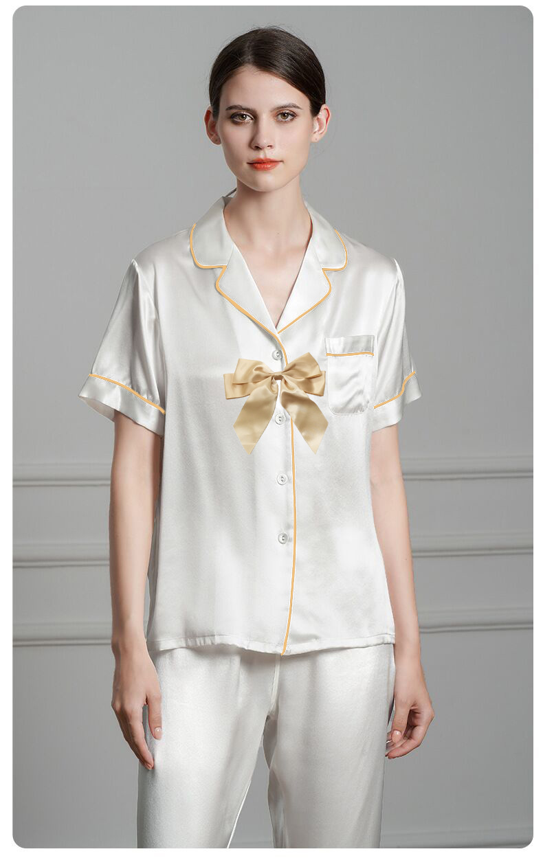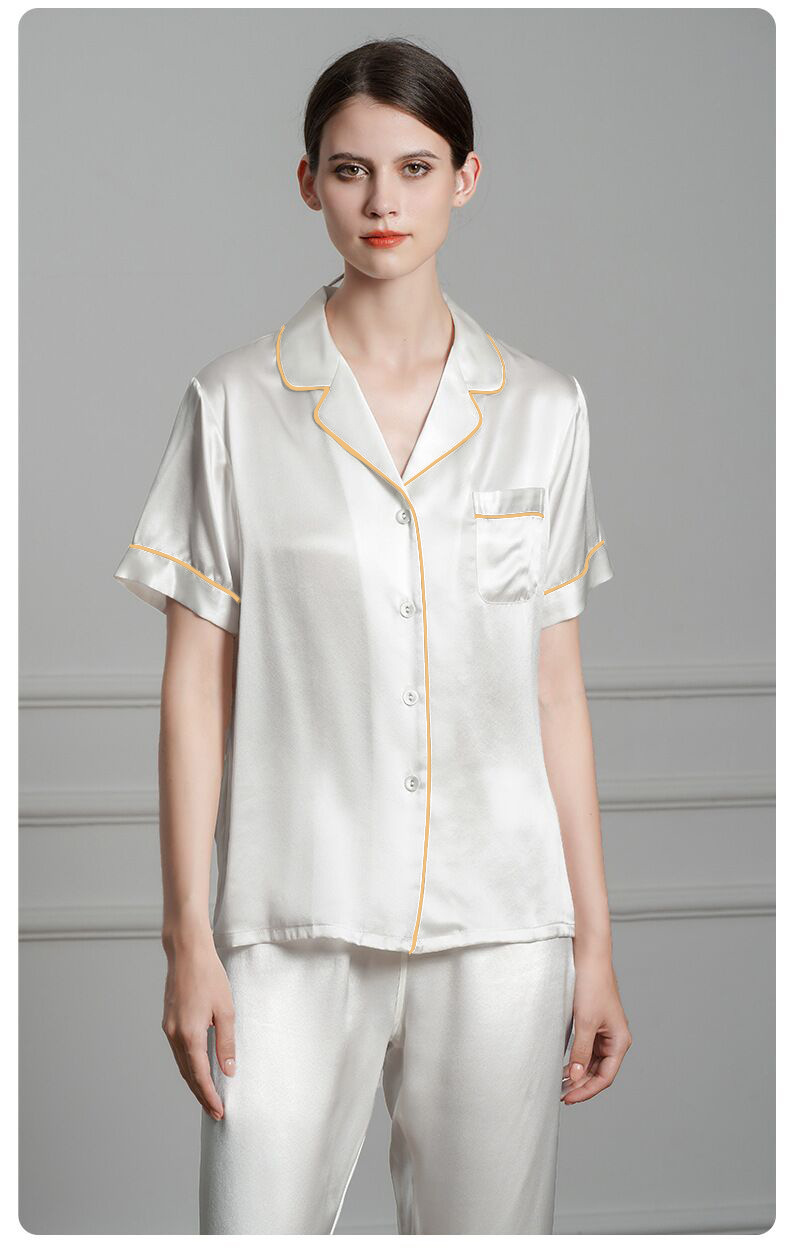 여성용 홈 의류 아이스 실크 반팔 바지 모조 실크 카디건 옷깃 여성용 파자마 단색 봄과 여름 새로운스토어 가기
