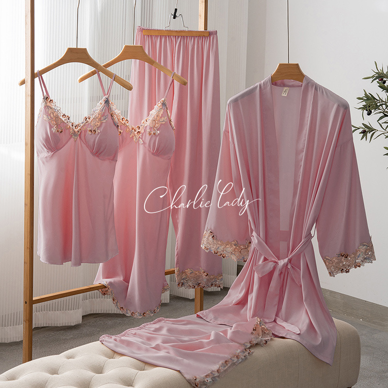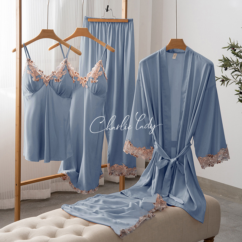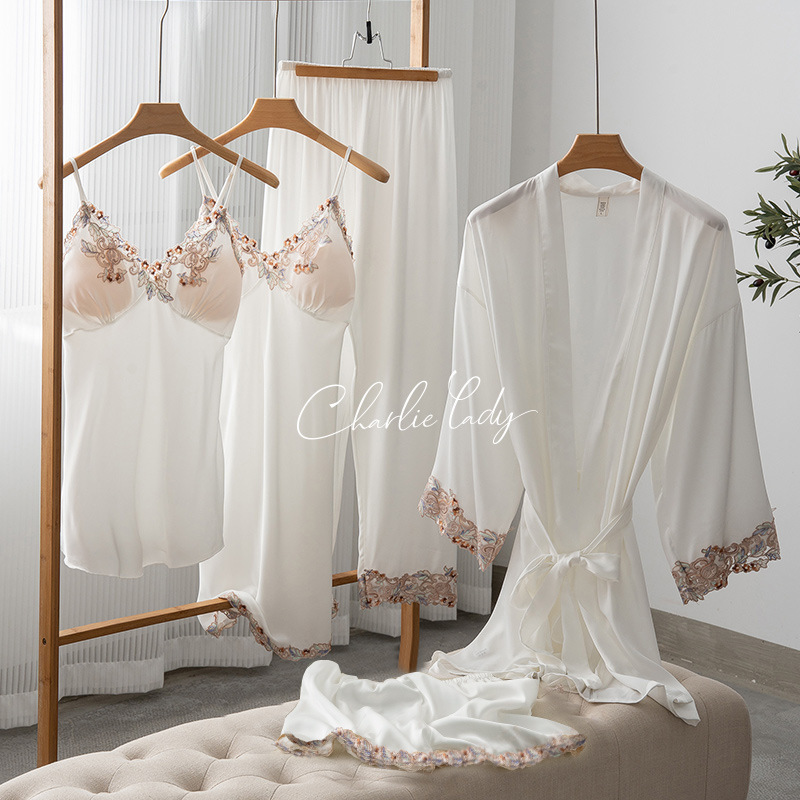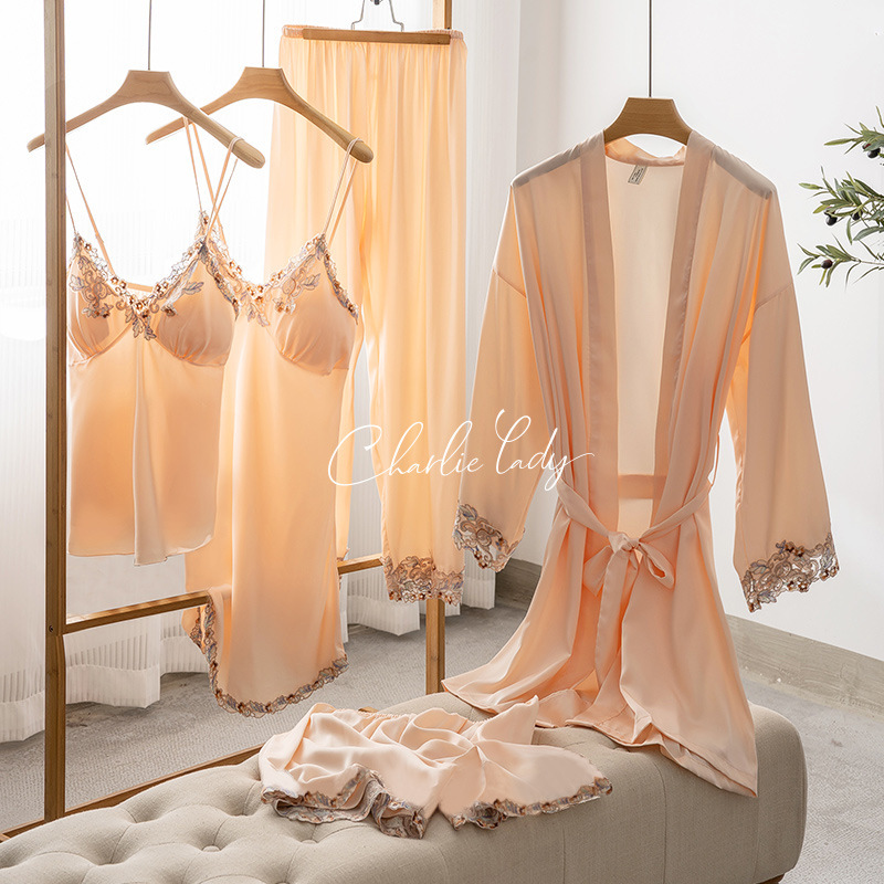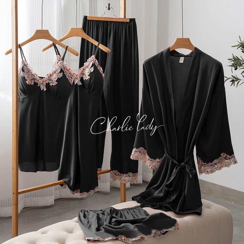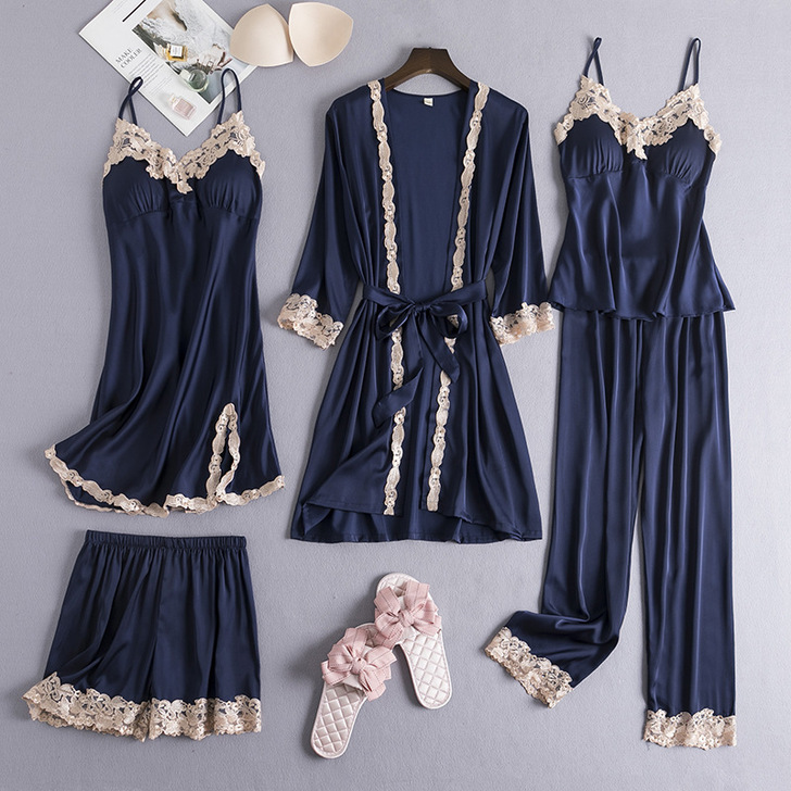 잠옷 여성용 여름 아이스 실크 슬링 나이트 가운 가슴 패드 실크 새틴 나이트 가운 5 개 세트 홈 의류