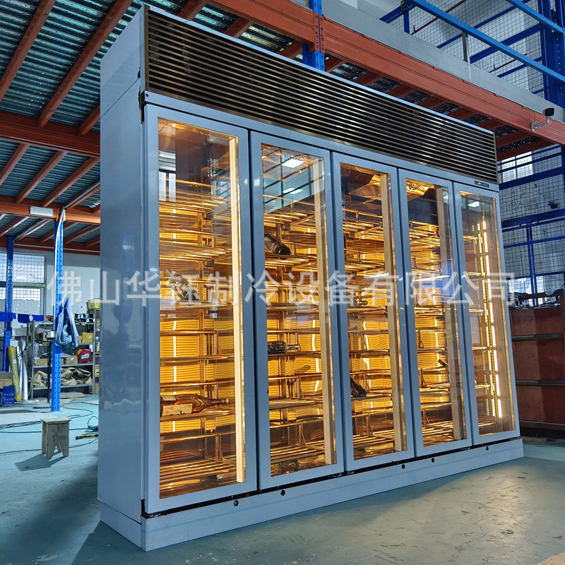 结构:正面面对机器,正面为五门钢化中空除雾玻璃不锈钢掩门体(暗拉手,带锁)其它为刚保温层。柜内为平式横放+可倾斜式不锈钢栅格可调架6层2700K暖光LED防水灯管。底部为万向轮+可调支撑脚。带蒸发水自动蒸发功能。