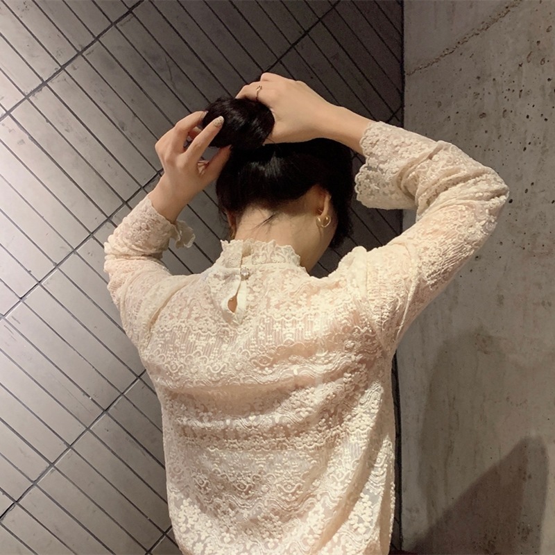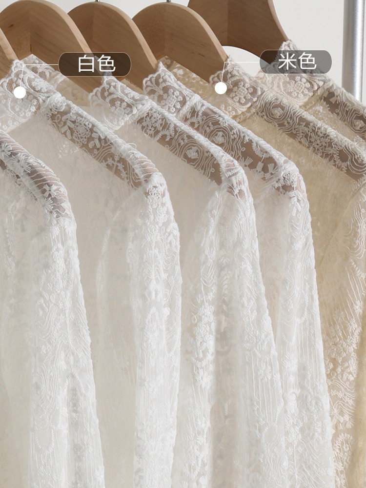 봄 새로운 스타일 웨스턴 스타일 셔츠 여자의 하프 하이 넥 자수 레이스 셔츠 슈퍼 요정 메쉬 기모 베이스스토어 가기
