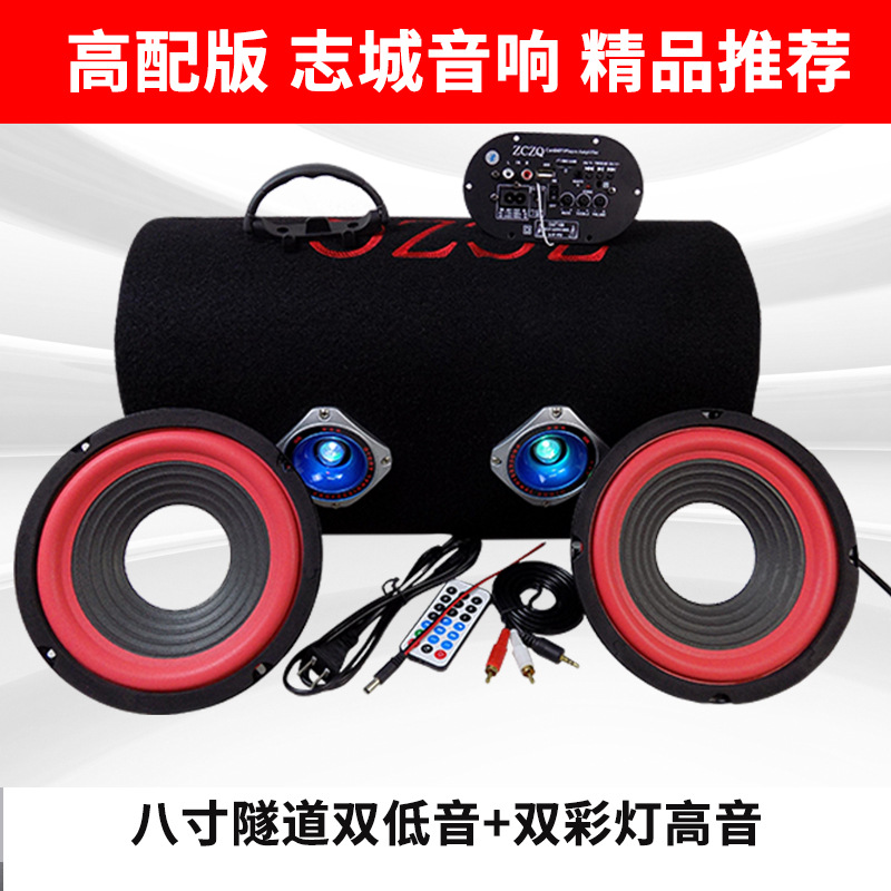 八寸双低音隧道低音炮,采用12厘中纤板加密度纸管,内打胶密封,配置2009进口集成功放,两个80磁25芯喇叭,双彩灯高音,超大音量,彩灯颜色有红、蓝、绿、紫、黑,可以备注;