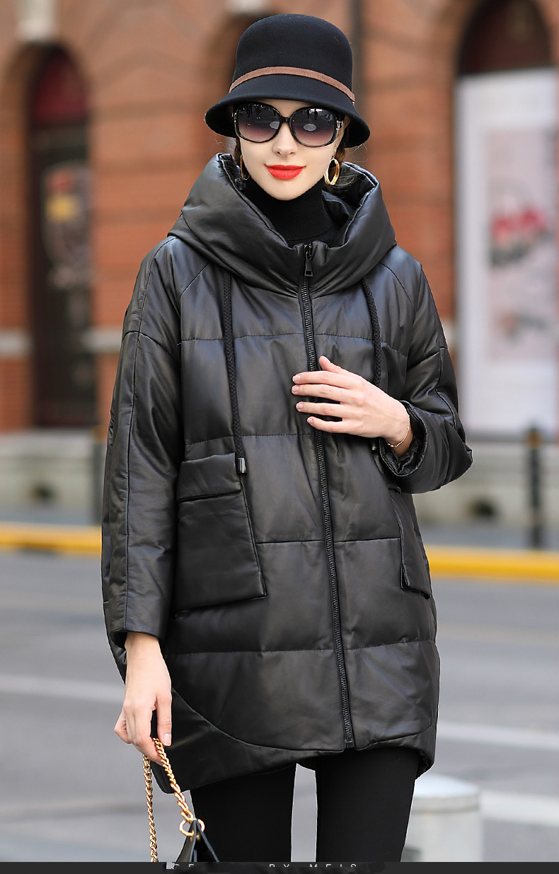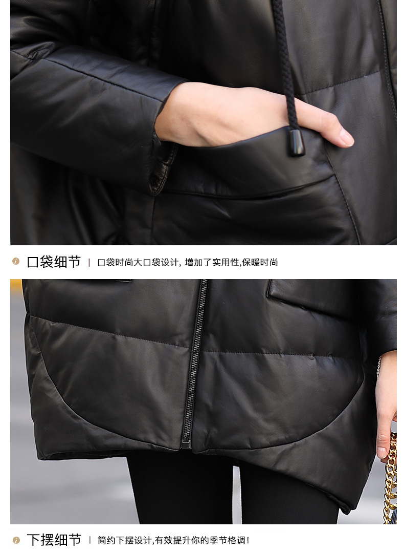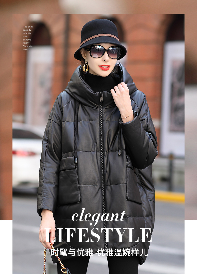 2024년 하이닝 겨울 신상품 여성용 중간 길이 캐주얼 루즈핏 후드 양가죽 다운 재킷