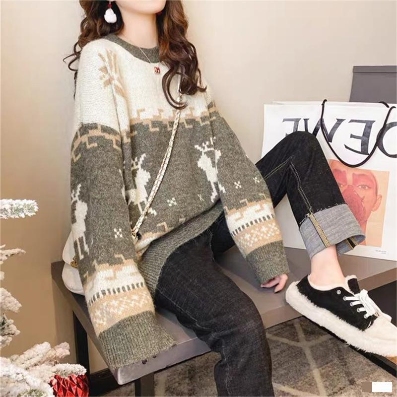 2022 가을과 겨울 새로운 빨간 크리스마스 새끼 사슴 풀오버 스웨터 여성용 한국식 느슨한 게으른 스타일 아우터웨어 모든 매치 탑