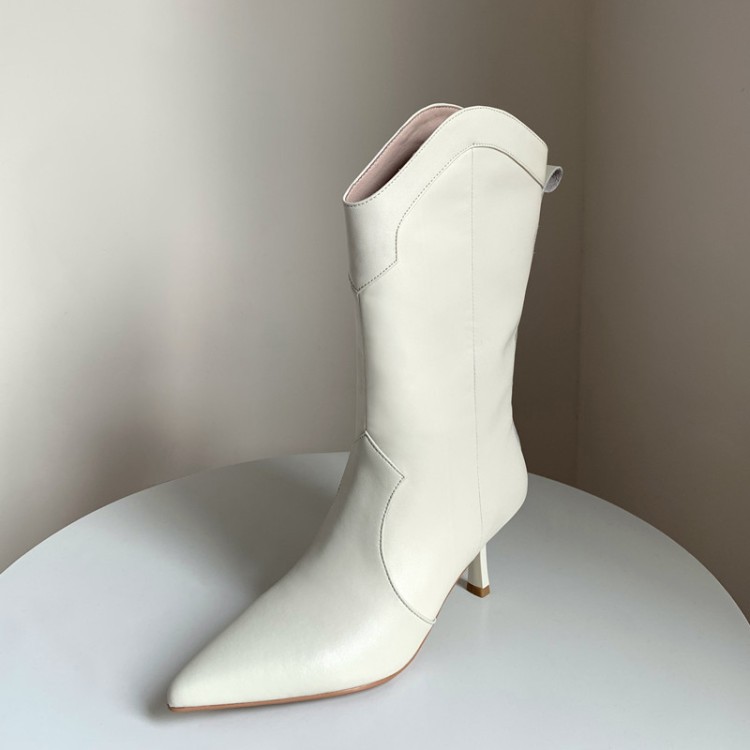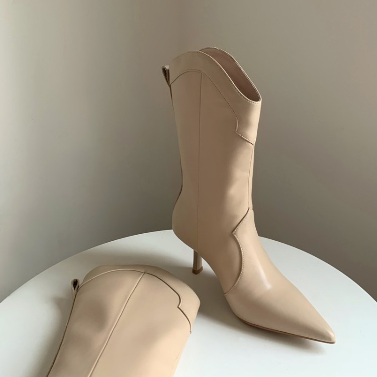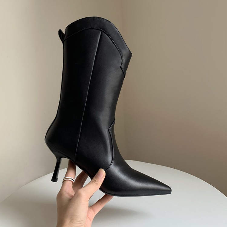 2020 가을과 겨울 유럽과 미국 뾰족한 간단한 얇은 뒤꿈치 여성 부츠 중간 길이 부츠 패션 서양 부츠 패션 하이힐 나이트 부츠스토어 가기