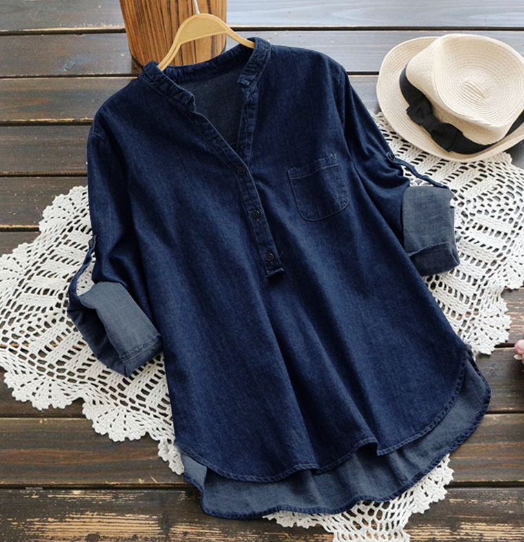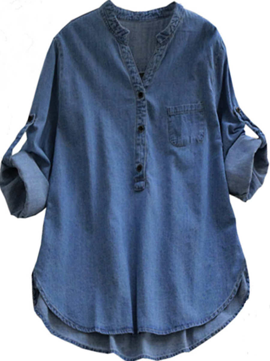 유럽 역 뜨거운 판매 폭발 물 데님 작은 스탠드 칼라 불규칙한 긴 소매 여성용 셔츠 재고스토어 가기